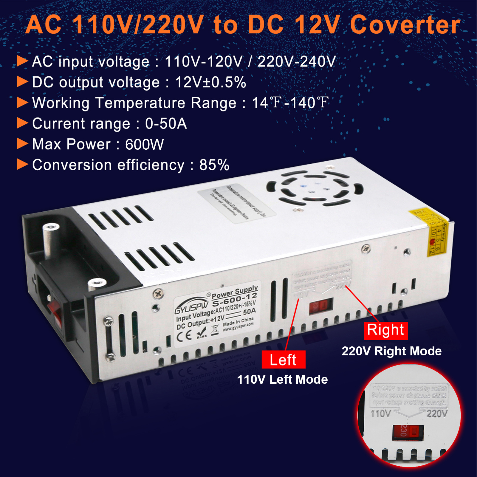 - Converts 100-240V household electricity to 12V DC power. Will 12V car appliances and other equipment for use at home.- Input voltage Support AC 110V-120V / 220V-240V , Output Range (12V 1A-5A, 12W-60W ) or (12V 10A-50A 120W-600W) ,voltage input will adjust automatically to SMPS Model ,Output current Mainly depends on your decive, such as 10A 120W, 20A 240W, 30A 360W, Max current up to 50A,Power 600W.