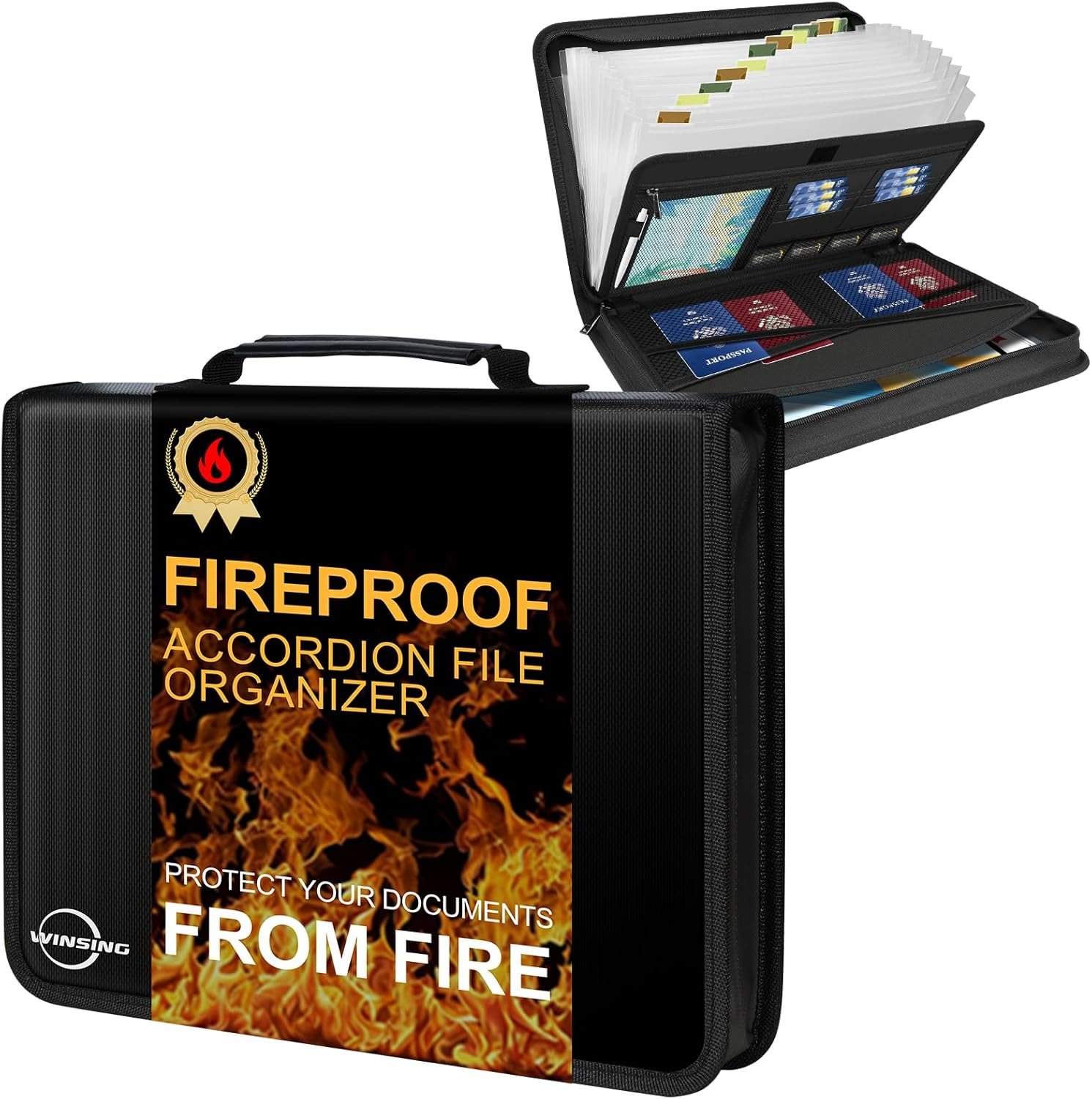 - Emergency File Folder Organizer : The fire proof document bag weighs 1.6 pounds and features a durable and soft handle. Evacuate within seconds without sacrificing safety. Lightweight fireproof document organizer cannot compete with bulky certificate holders and binder organizers. The padded handle, lightweight structure, and multi size pockets make it an ideal choice for family organizers to store important documents such as passports, visas, cash, and legal size file.