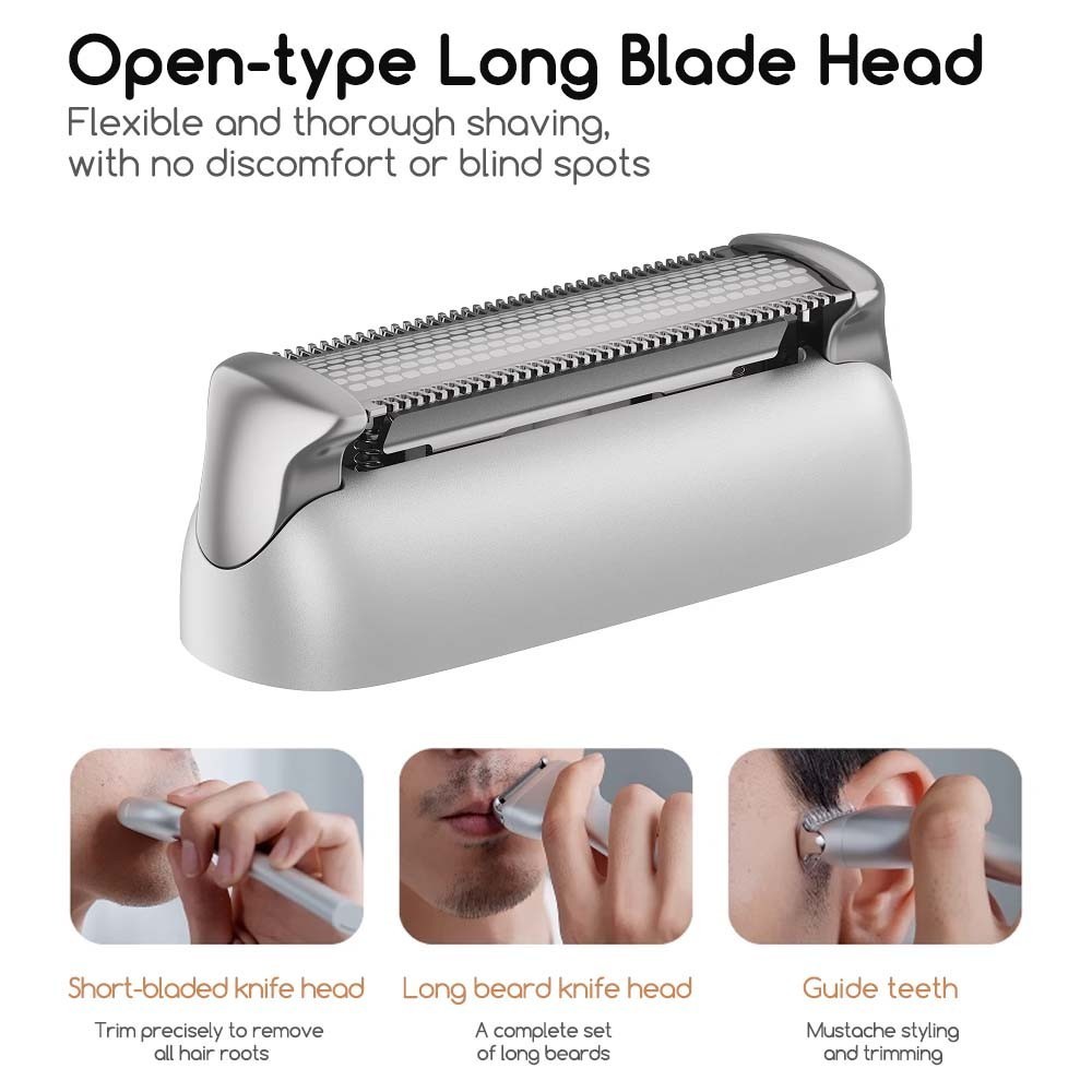 *Straight Horizontal Blade Head Design: Contours to the skin for easier shaving, sharper performance, and higher processing precision, offering a larger contact area compared to curved blade heads that do not fully contact the skin at both ends.