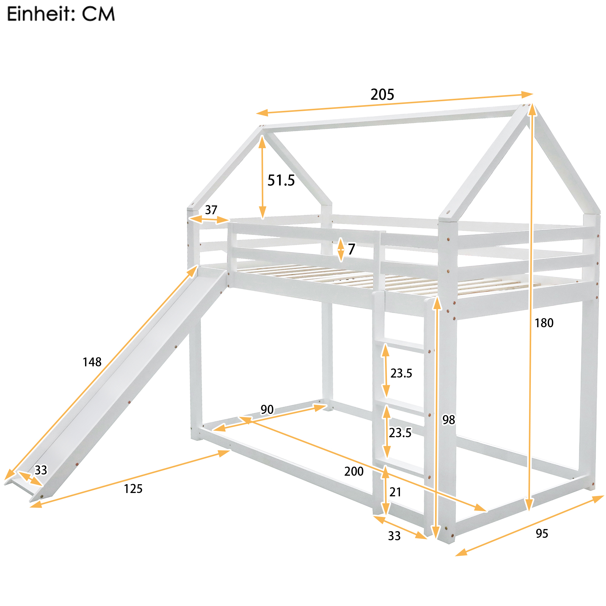 Verleihen Sie dem Schlafzimmer Ihres Kindes eine Prise Kreativität mit diesem Doppel-Etagenbett in Hausform. Dieses Etagenbett in neutraler Farbe ist geschlechtsneutral und sowohl für Jungen als auch für Mädchen geeignet. Dieses aus Kiefernholz und MDF-Platte gefertigte Etagenbett ist für eine solide Stabilität und Sicherheit hergestellt. Die durchgehenden Absturzsicherungen für das obere Bett sorgen für Sicherheit für die Kleinen. Mit der angebrachten Leiter können Ihre Kleinen problemlos in das obere Bett gelangen, und mit der Rutsche können Ihre Kinder eine tolle Zeit mit ihren Freunden verbringen, und Sie können auch die Position der Rutsche und Leiter ändern. Erfüllen Sie das Schlaf- und Spielbedürfnis gleichzeitig, dieses Etagenbett mit Rutsche wird zu einer beliebten Einheit im Schlafzimmer Ihres Kindes.