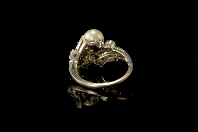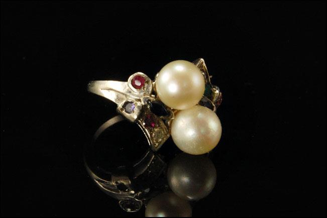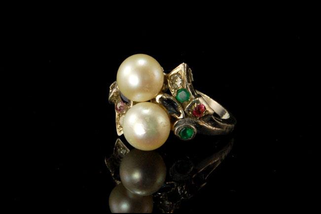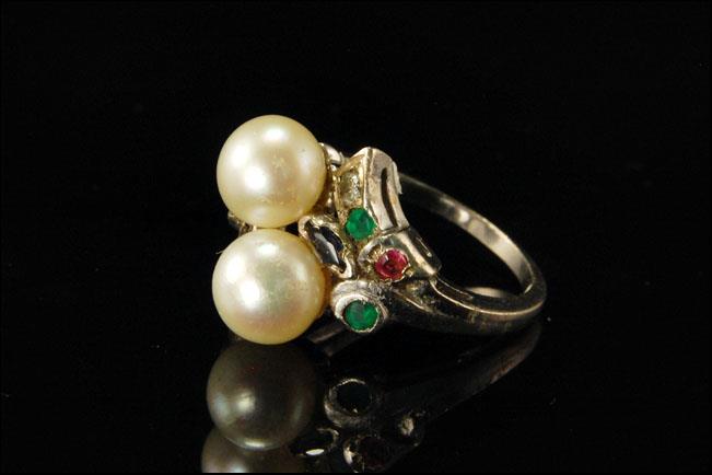 This is a very beautiful, old and unique ART DECO STYLE AKOYA PEARL EMERALD DIAMOND RUBY TOPAZ 14K GOLD c. 1940 size 6 (weight 5.3g). The ring has a marvelous Art Deco style, nice lwhite luster pearls in good quality ( 7.5 mm) with emerald, pink and blue topaz, diamonds, ruby (1.5 mm) and 14K white gold (bottom has 14K). The ring is in very good condition.
