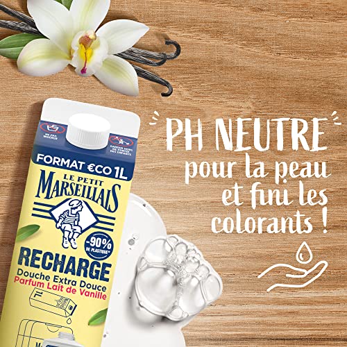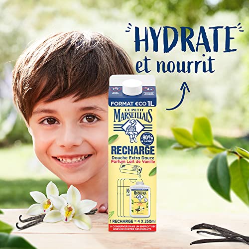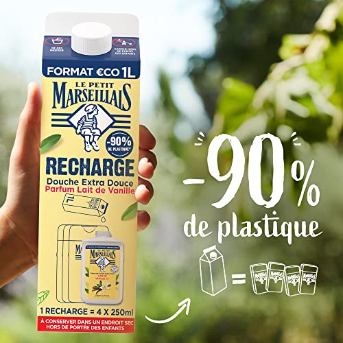 Le Petit Marseillais- Recharge Crème de Douche Extra Douce Lait de Vanille Bio (brique de 1 L)– Recharge gel douche avec 92 % d'ingrédients d'origine naturelle– pH neutre pour la peau et sans colorant