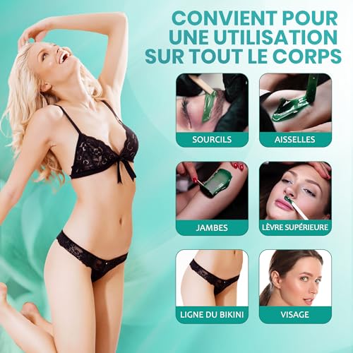 CIRE ADAPTÉE À TOUTES LES ZONES ET TYPES DE PEAU : Efficace sur les jambes, les bras, le visage, les sourcils, le nez, le maillot et les zones intimes, pour une épilation complète du corps. Convient aux hommes et aux femmes pour un résultat longue durée.