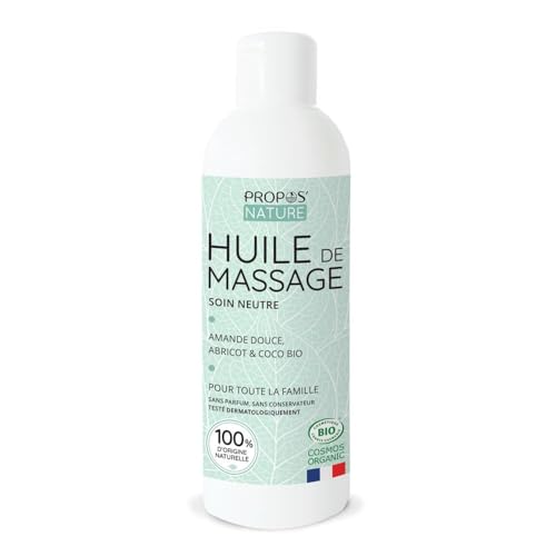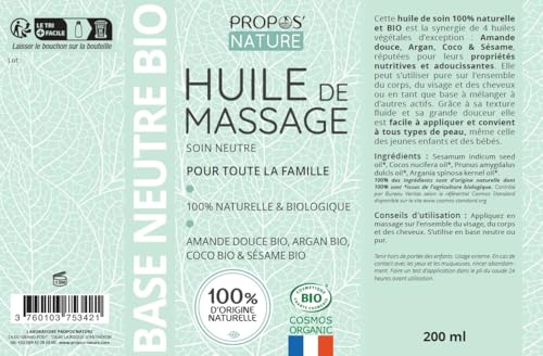 Huile de massage neutre Bio - 4 huiles végétales Bio - Amande douce, Abricot, Coco & Sésame - 100% naturelle - Fabriqué en France - PROPOS'NATURE