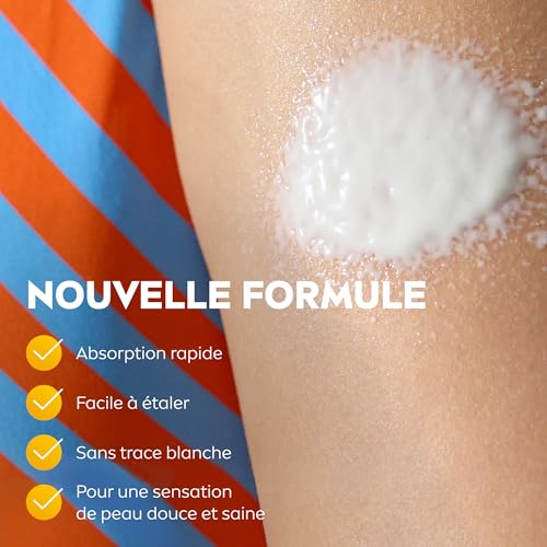 Conseils d’utilisation — Bien agiter avant l’application. Appliquez généreusement et de façon homogène sur la peau avant l’exposition au soleil. Renevoulez fréquemment l’application, particulièrement après avoir transpiré, nagé ou vous être essuyé. En réduisant la quantité, vous diminuez le niveau de protection. Évitez le contact avec les yeux.