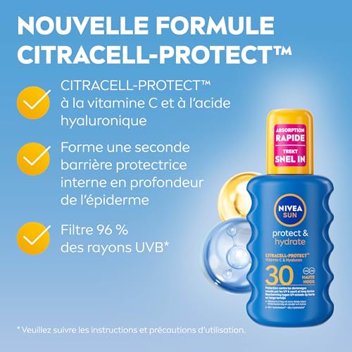 NIVEA SUN Spray Solaire Protect & Hydrate SPF 30 200 ml — Crème Solaire résistante à l'eau — Protège et Hydrate — Haute Protection Visage et Corps
