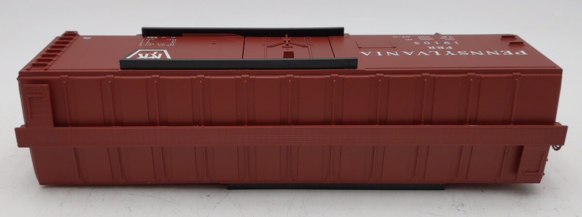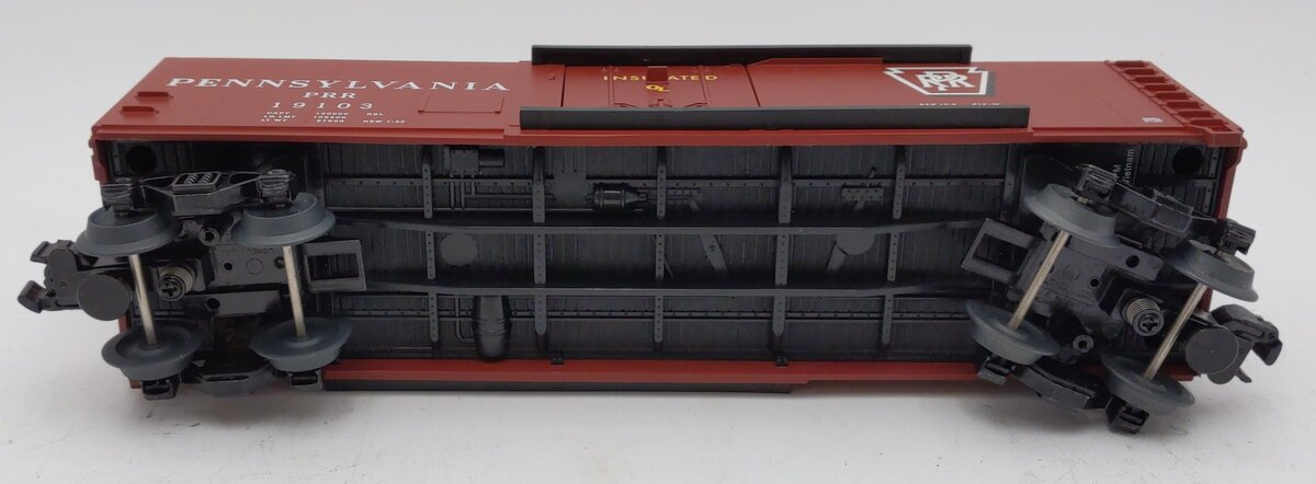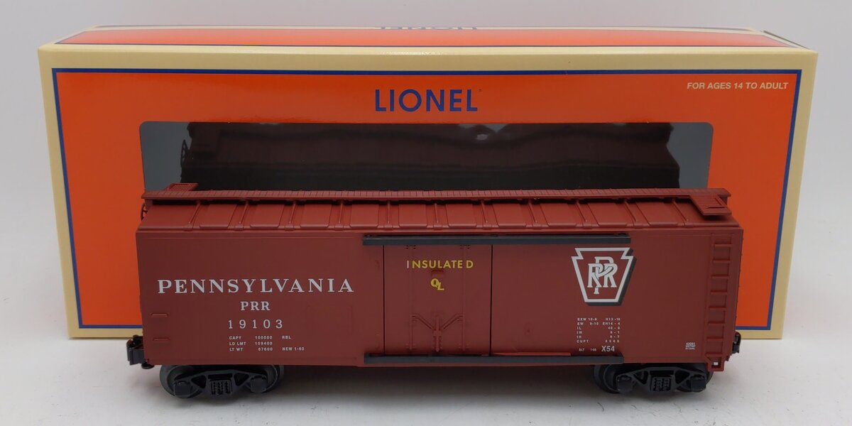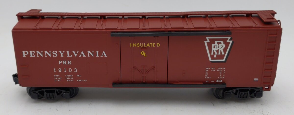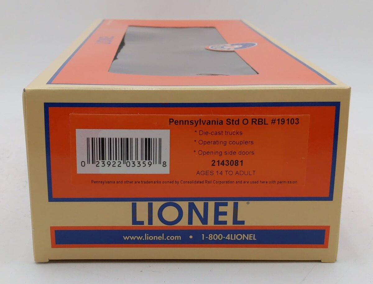 This is a Lionel 2143081 O Pennsylvania RBL Plug Door Boxcar #19103. Scale in size but simplified in detail, the return of these Standard O freight cars offers an affordable way to build up your freight trains! Die-cast trucks, Operating couplers, Opening side doors, Min Curve: O31 , Dimensions: Length: 11 1/8.