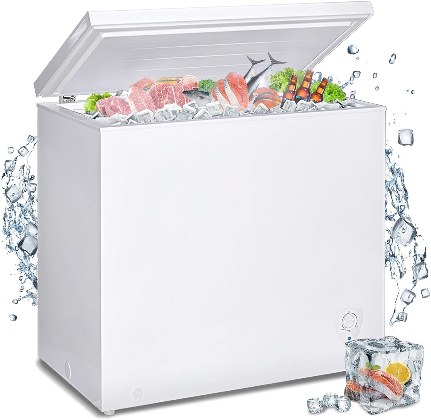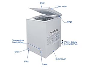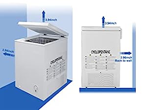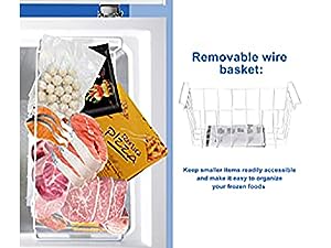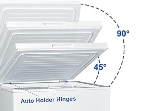 Humanized structureAdjustable Thermostat: Adjust the temperature of the freezer as needed. Adjustable feet: Balance the chest freezer on an uneven surface. | Auto maintain door hingeTop hinged door design saves floor space. SMAD freezer has auto-hold door hinges between 45° -90° angles. Easily access the chest freezer hands-free. | Removable storage basketThe hanging basket of this freezer chest provides convenient access and makes smaller items readily available. Swipe to quickly view the items below. | Placed in suitable spaceProper refrigerator space: at least 3.94 inches of free space on top, 3.94 inches on the left and right, and 2.96 inches on the back. |