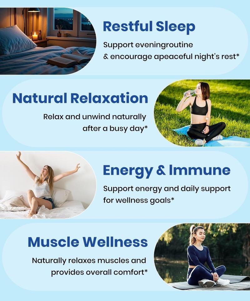 Ashwagandha + L-Theanine promote relaxation, reduce stress, and improve mental clarity.