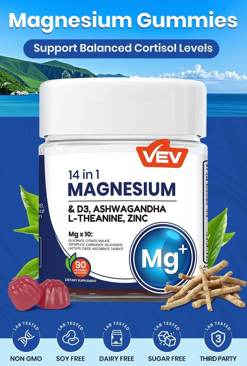 10 bioavailable magnesium blends (glycinate, citrate, malate, etc.) + Ashwagandha, L-Theanine, Vitamin D3 & Zinc.