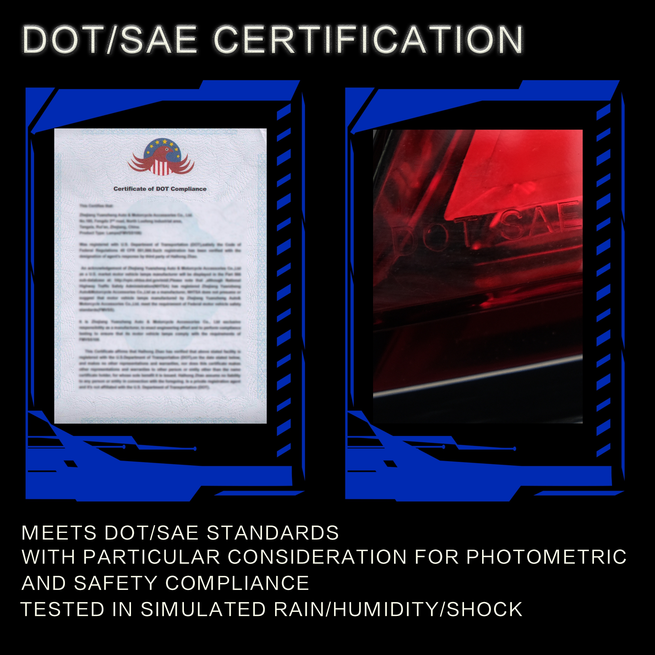 Certification: E-MARK、 S.A.E. (Society of Automotive) and D.O.T. (Department of Transportation)