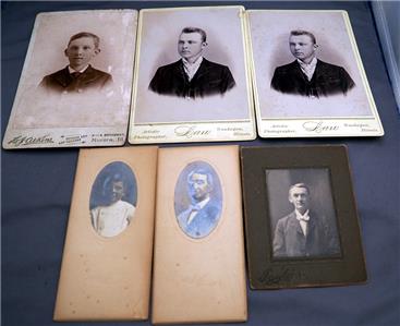 - Five images are of men. Three are classic Carte DeVisite cards (approximately 7 5/8” x 4.25”). Two are of the same person, the name on the back of one of those is Frank Alfred Rylander. The small, narrow card with the image of a man on it appears to be a Daguerreotype: changing the angle of viewing shows a negative image. On the back it looks like there is the name “Gridley” and Josie Smith first husband. The name might be Grisley or Grinley.