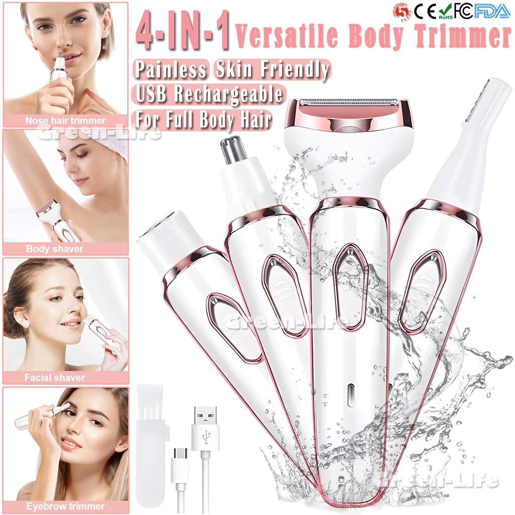4-IN-1 MULTIFUNCTIONAL SHAVER – Complete grooming kit includes 4 interchangeable heads for precision trimming and shaving on face, body, bikini area, underarms, nose, and eyebrows.