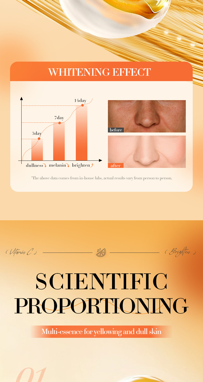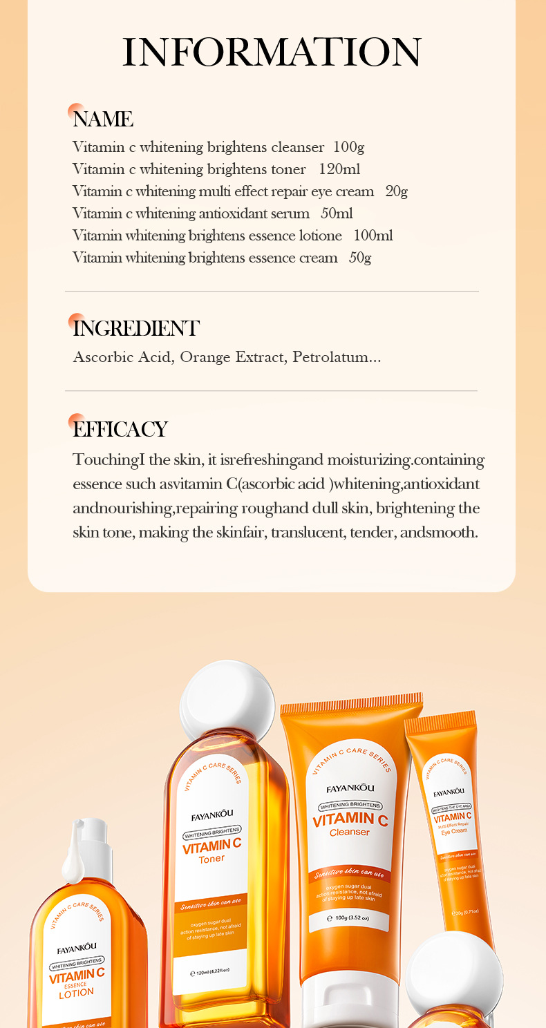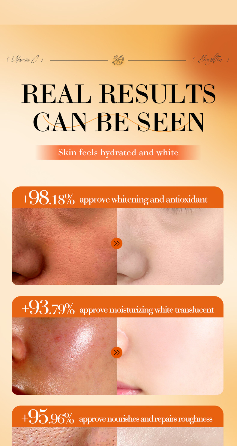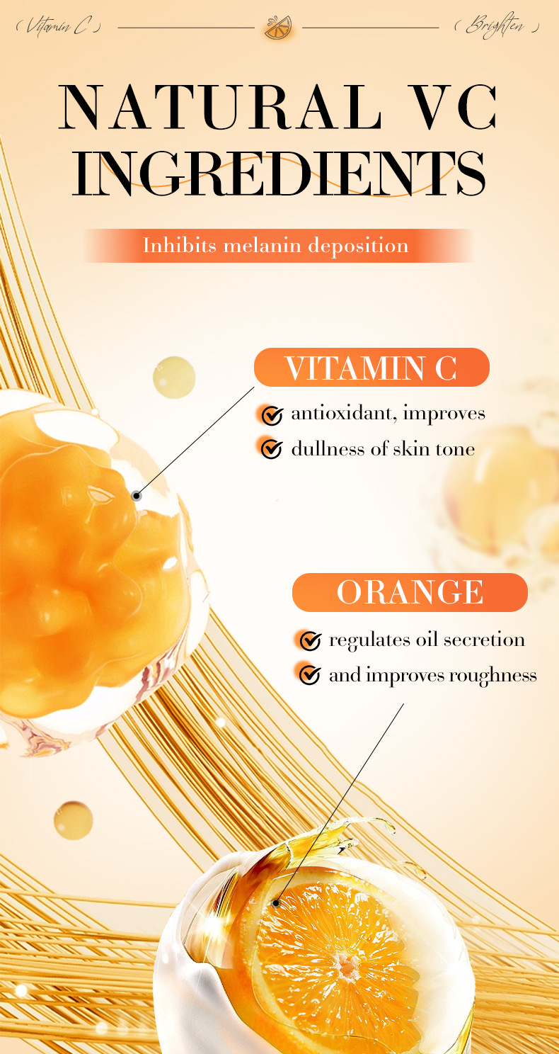 EFFICACY TouchingI the skin, it isrefreshingand moisturizing.containingessence such as vitamin C(ascorbic acid)whitening,antioxidantandnourishing,repairing roughand dull skin, brightening theskin tone, making the skinfair, translucent, tender, andsmooth.