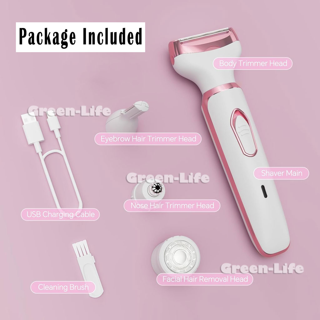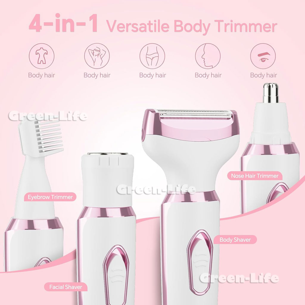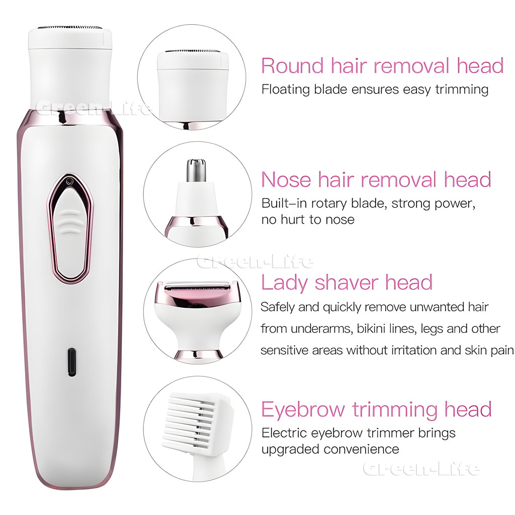 4-IN-1 MULTIFUNCTIONAL SHAVER – Complete grooming kit includes 4 interchangeable heads for precision trimming and shaving on face, body, bikini area, underarms, nose, and eyebrows.