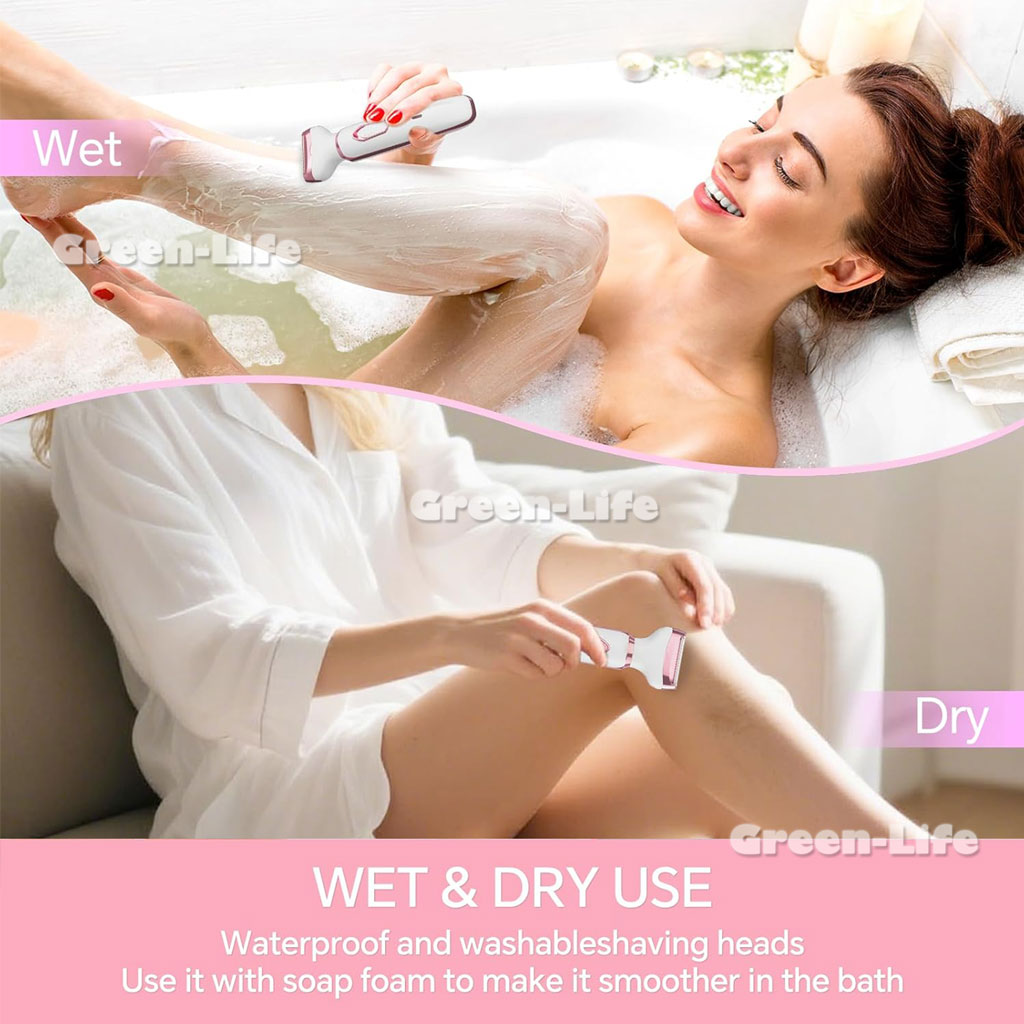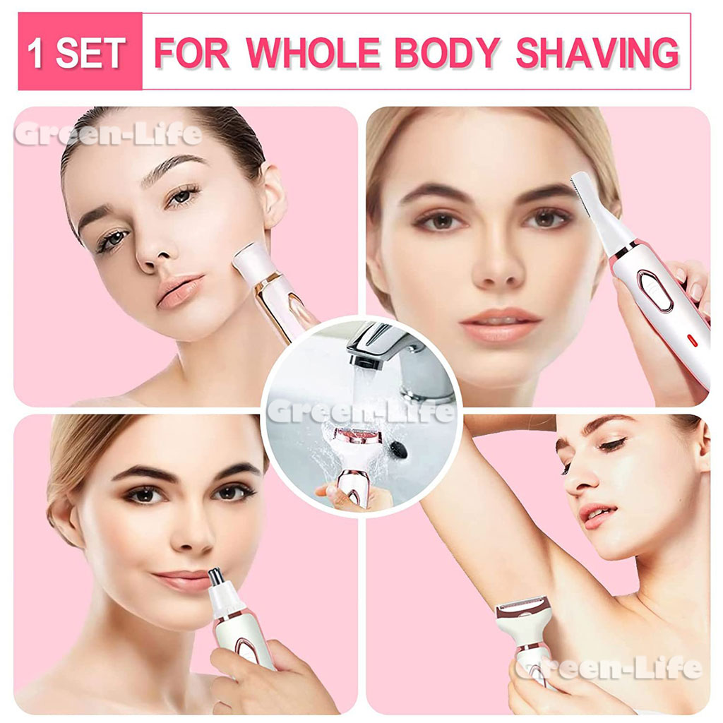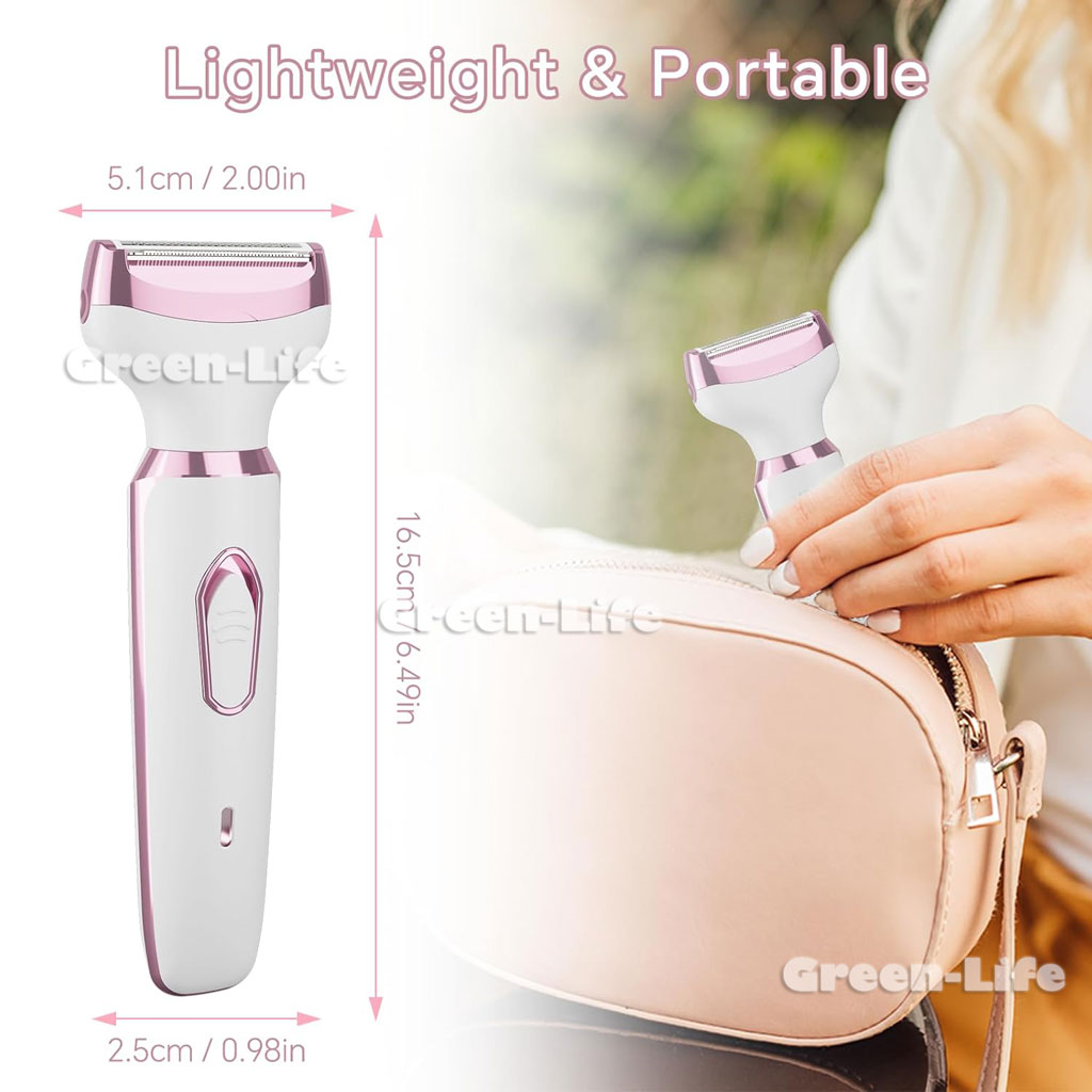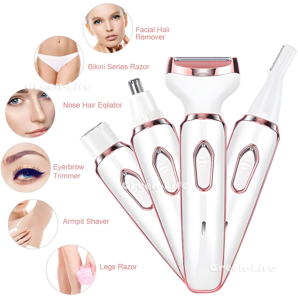 4-IN-1 MULTIFUNCTIONAL SHAVER – Complete grooming kit includes 4 interchangeable heads for precision trimming and shaving on face, body, bikini area, underarms, nose, and eyebrows.
