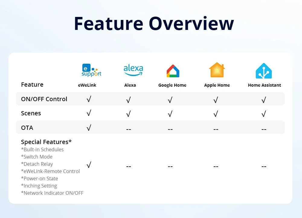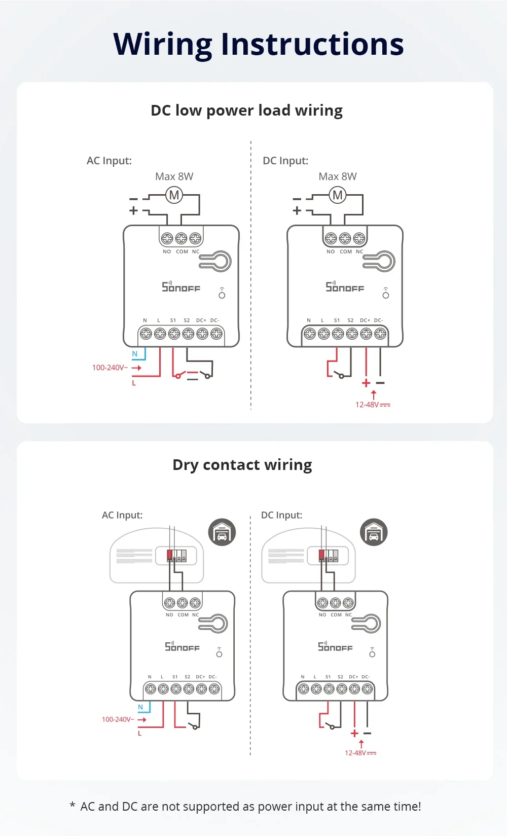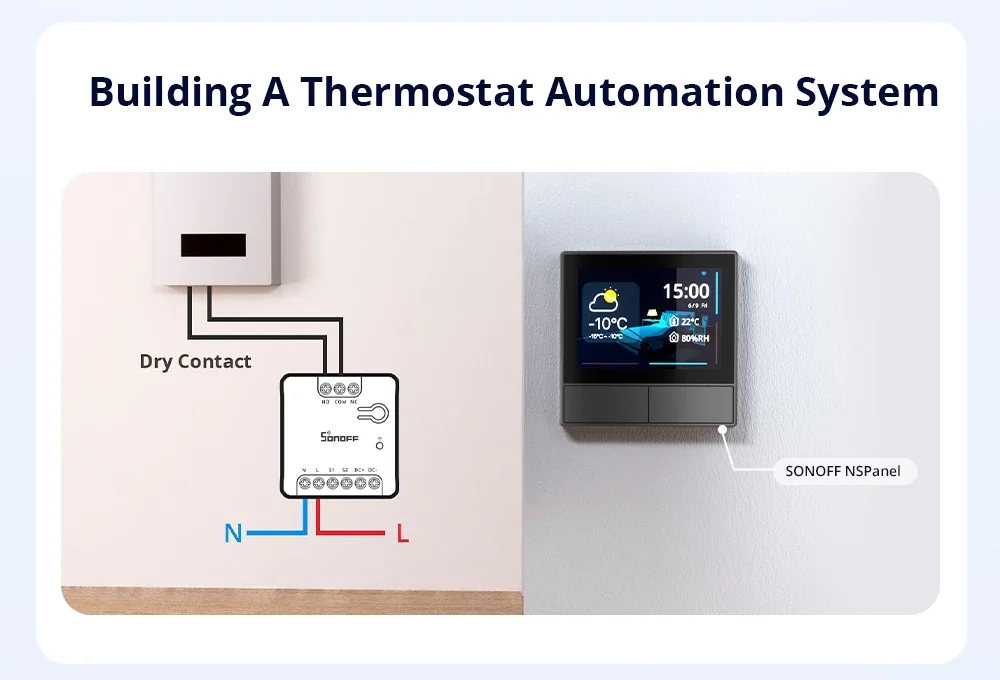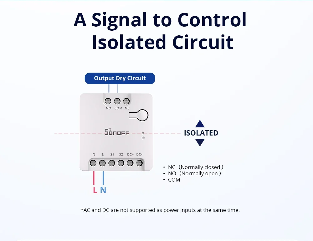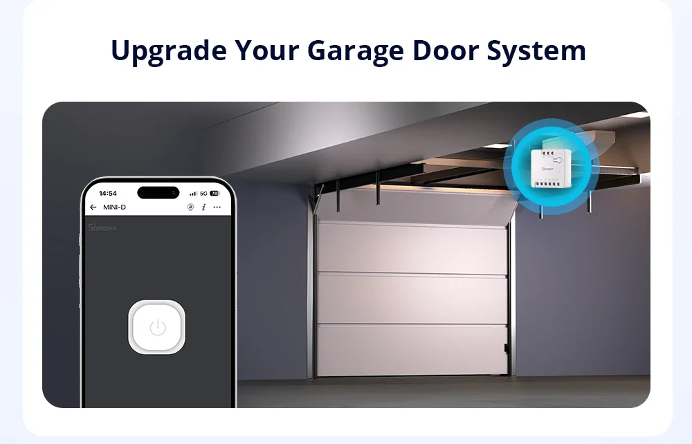 SONOFF MINI Dry Wi-Fi Smart Switch | MINI-D Note: Tuya is not supported, and Smart Life is not supported. Only Sonoff or eWeLink are supported. MINI-D is a Wi-Fi dry contact smart switch that supports AC/DC power supply. It can be used to control motors, garage doors, and other dry contact input devices, offering remote control, voice control, and other functions through the APP. With Matter protocol support, it can work across different platforms, including major operating systems and ecosystems like Amazon Alexa, Google Home, and Apple Home, Home Assistant, making it easier for users to manage their smart home ecosystem, improve interoperability, and enhance overall user experience. A Signal to Control Isolated Circuit Dry contact (Voltage-free contact) acts purely as a bridge for signal transmission between two points, typically in the form of an open or closed circuit that does not have a direct power supply. The power supplied to the module is completely isolated from the switched load, which helps prevent electrical faults and enhances safety. Upgrade Your Garage Door System Make your garage door smart withMINI-D which offers remote control and seamless automation. You can open or close your garage door from anywhere using a smartphone app. Upgrading to a smart garage door system provides greater control. Building A Thermostat Automation System An automated thermostat system offers intelligent temperature control for homes and buildings, optimizing comfort and energy efficiency. lts smart schedule can be customized according to your habits and is also integrated with other smart home devices. This not only enhances convenience but also helps reduce energy consumption, leading to lower bills and a more sustainable living environment. Controlling A Large Current with A Small Current MINI-D has a relay with a rated current output of 2A. When integrated with the contactor, a low-power control circuit can safely and efficiently manage high-power systems without direct user intervention, which enhances safety, reduces power consumption in control circuits, and provides precise control over larger loads. Automation for DC Low-Power Solenoid Valves/Motors Specifically engineered to control DC low-power solenoid valves or motor loads up to 8W, it is a perfectly smart control that is cost-effective and reliable for a wide range of DC low-power applications.