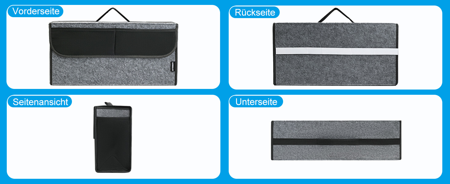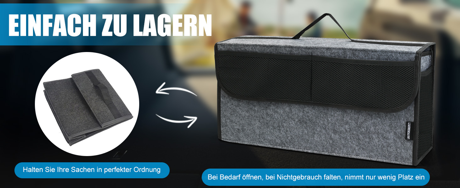 Hochwertiges Auto-Zubehör von AUTOXBERT Dieser Kofferraum-Organizer bringt Ordnung in Ihr Fahrzeug. Er dient als praktische Aufbewahrungsbox im Auto und bietet ausreichend Platz für Reinigungsutensilien, Werkzeuge sowie diverse Kleinteile und lose Gegenstände wie Warnwesten, Warndreiecke oder Verbandskästen.