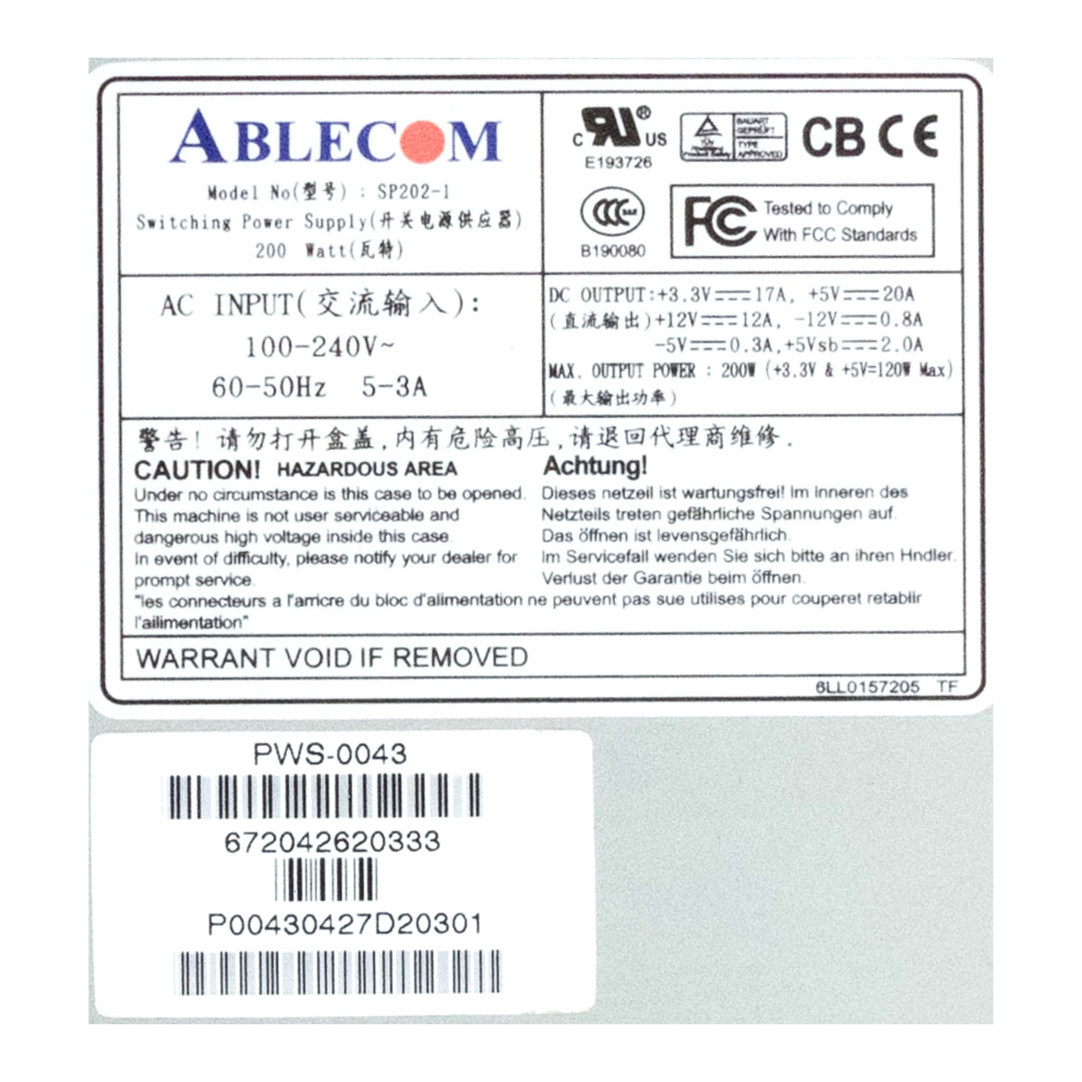 ABLECOM SP202-1 200W 9PA2003905 PWS-0043 Supermicro Power type Non Hot Swap Manufacturer ABLECOM Part number 9PA2003905 Model SP202-1 / PWS-0043 Maximum performance (watts) 200 Input 100-240V ~ 60-50Hz 5-3a Kabel P1 24-PIN, ATX12V 4-PIN, 2x Molex No original packaging. Is sealed in a static Beuatel. Written guarantee - 3 years !!!