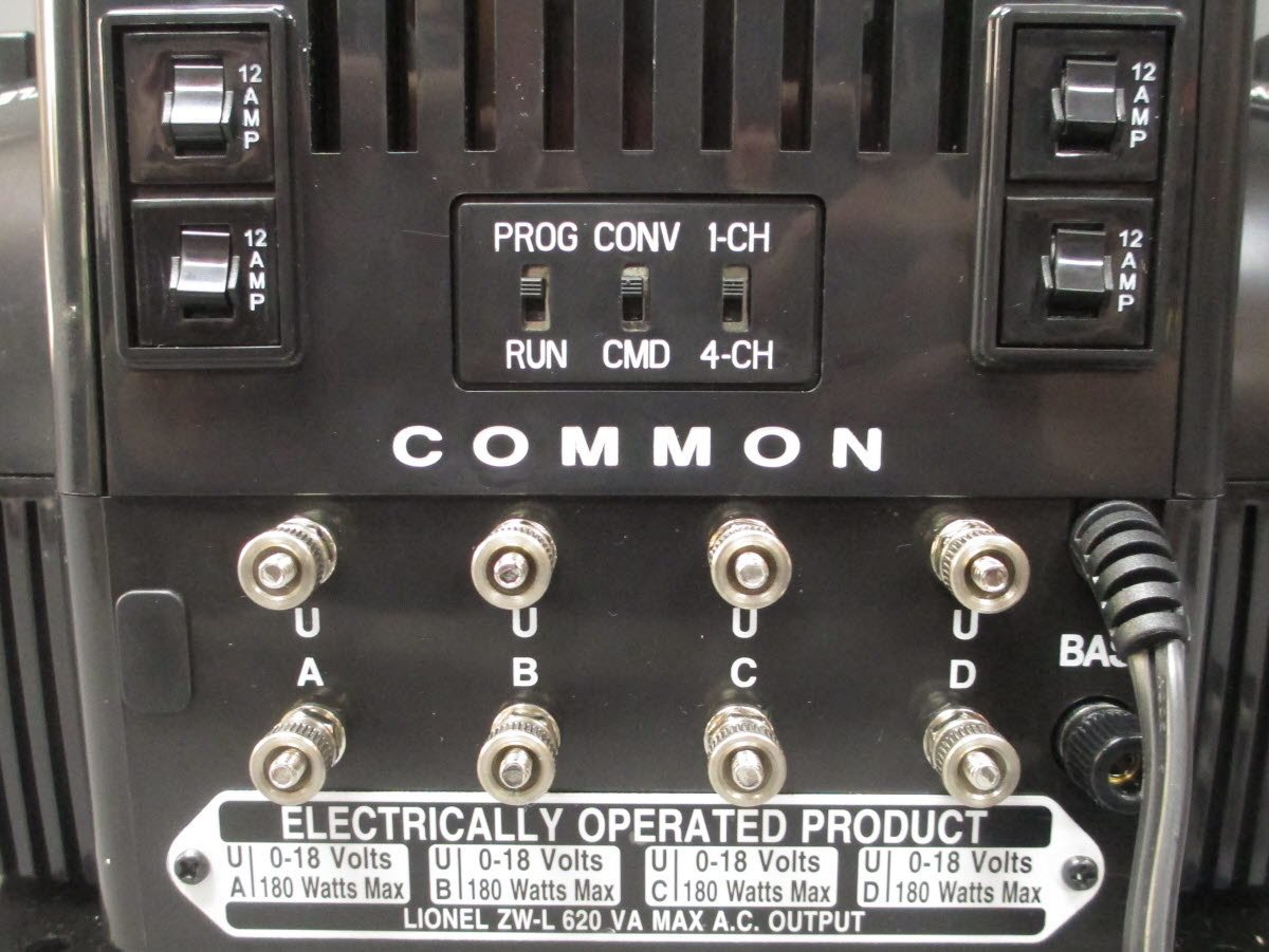 A ful6 620-watts of power are built inside the unit, so there’s no need for separate power bricks. To keep your Controller operating safely, the ZW-L also comes equipped with an automatic temperature controlled cooling fan, a circuit breaker for each channel output, and an on/ off switch on the front. Additionally, LIONEL letters light up in blue on the front face of the unit when the ZW-L is turned on.