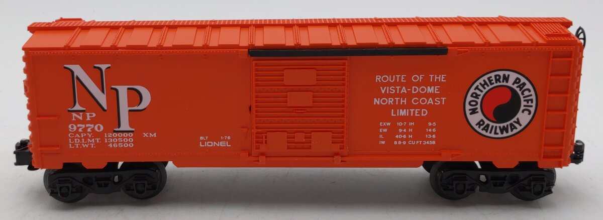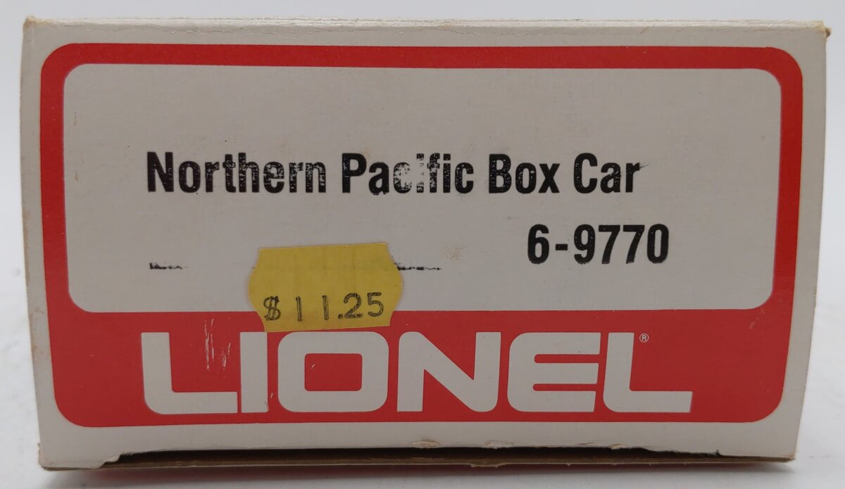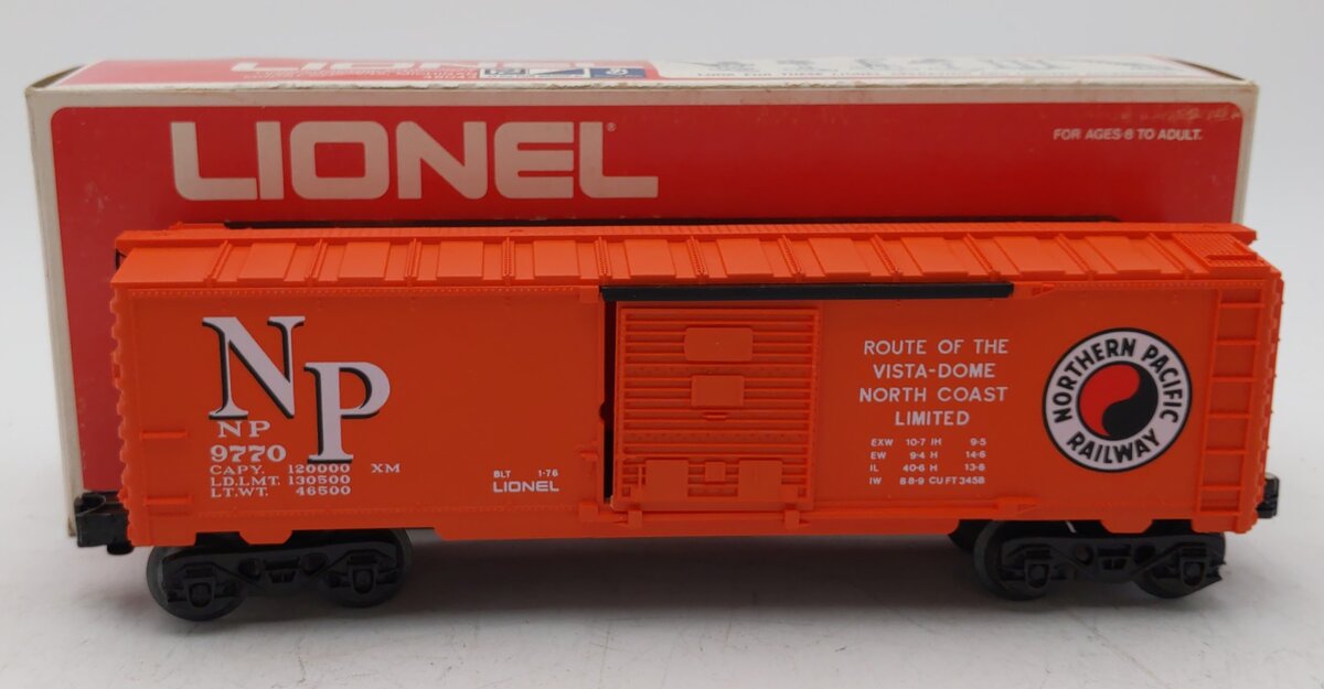 Here is a Lionel 6-9770 O Gauge Northern Pacific Boxcar #9770. This boxcar features sliding doors, plastic trucks, operating knuckle couplers, metal wheels and axles.