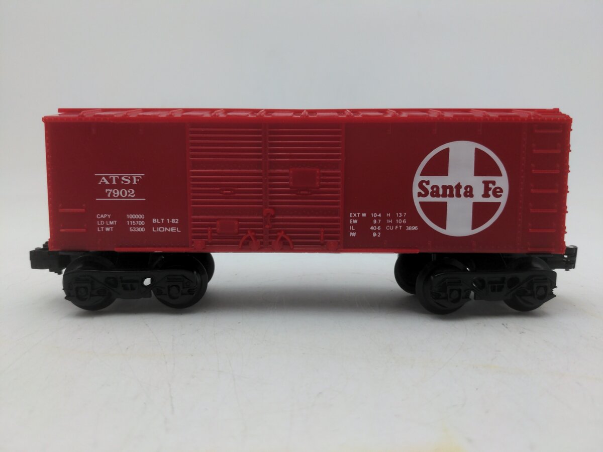 This is a Lionel 6-7902 O Santa Fe Short Boxcar from 1982-85. This boxcar features sliding doors, plastic trucks, operating knuckle couplers, metal wheels and axles.