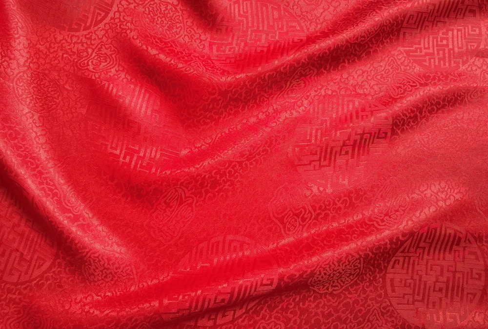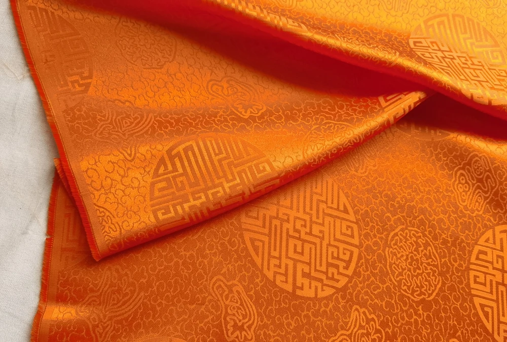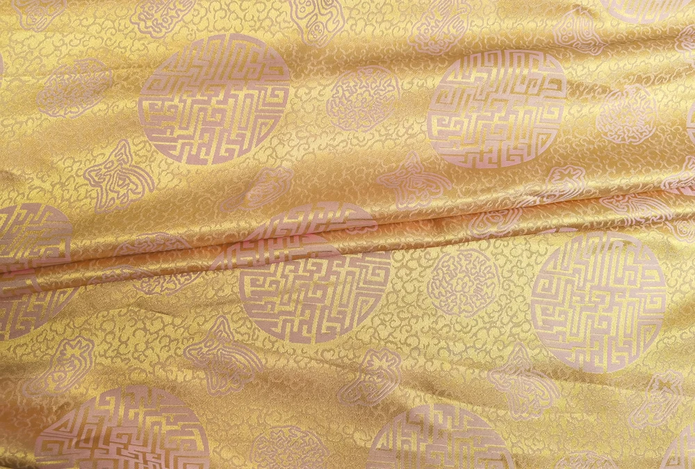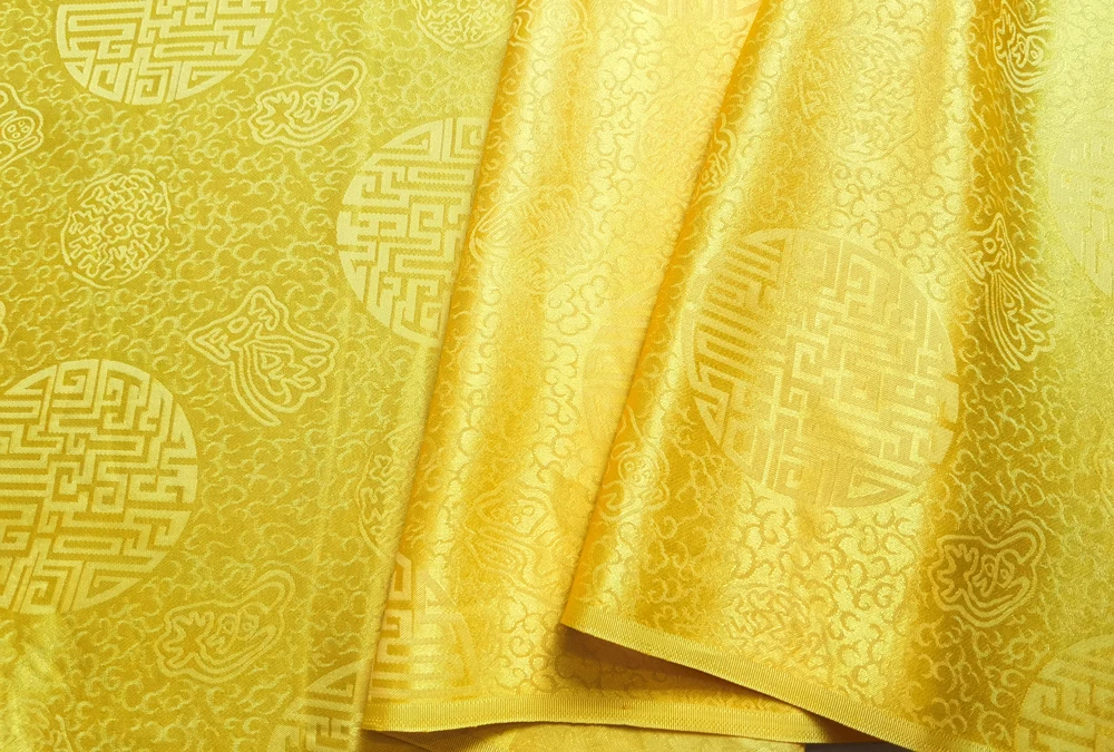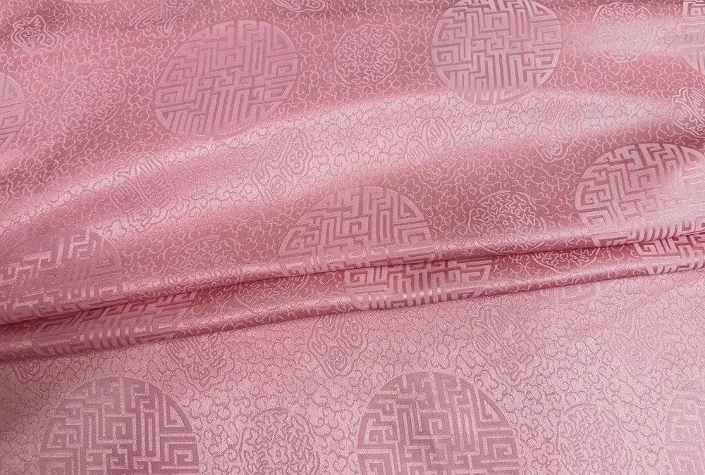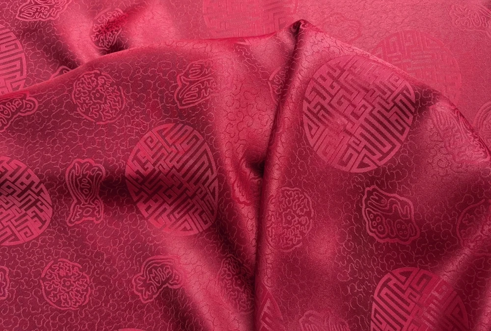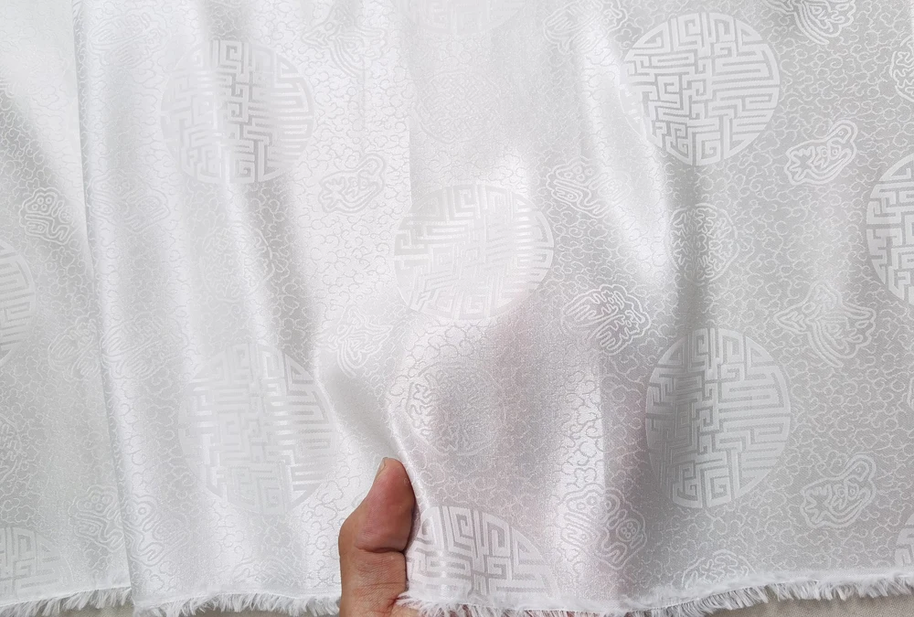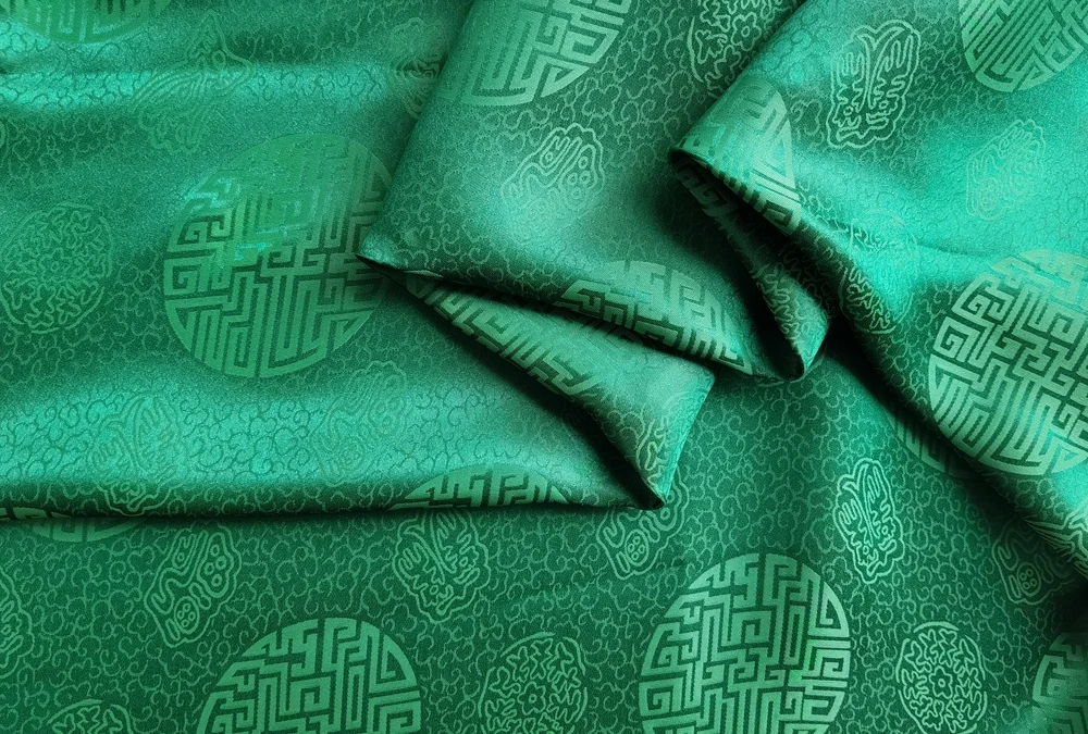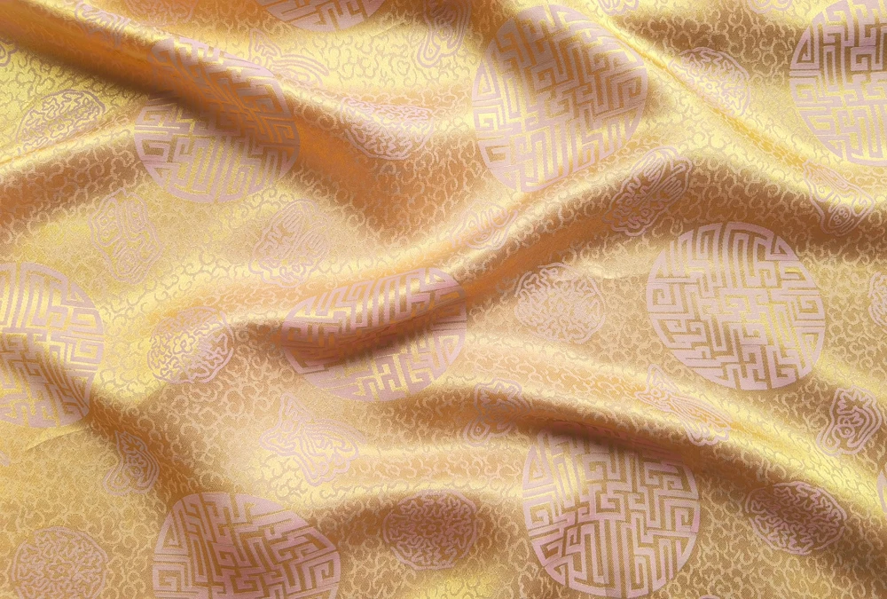 1)Material:Mulberry Silk + Cotton Blended Charmeuse Jacquard,45" Wide,Quality 17momme,Chinese Traditional Pattern