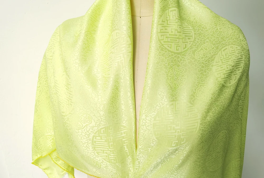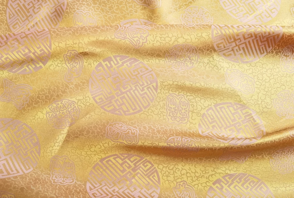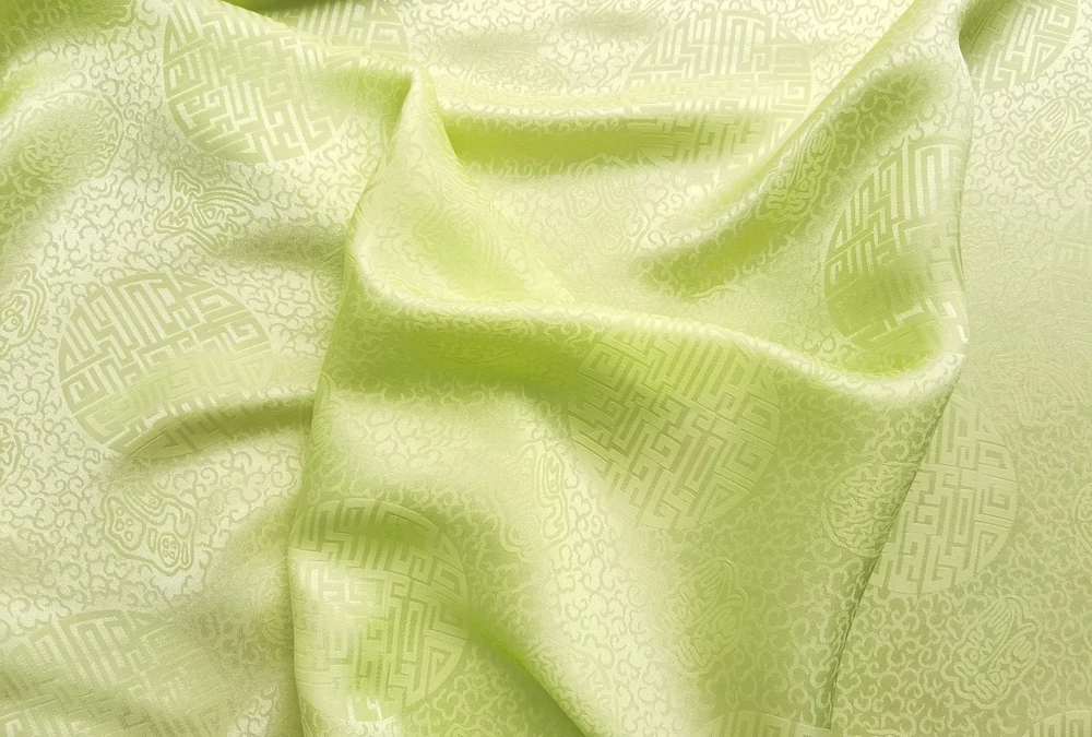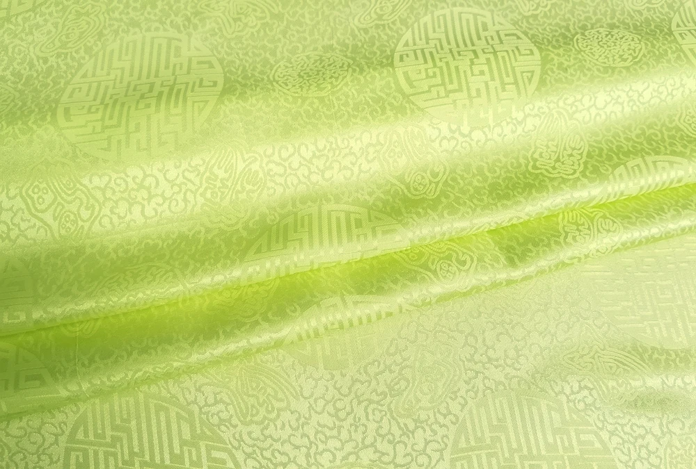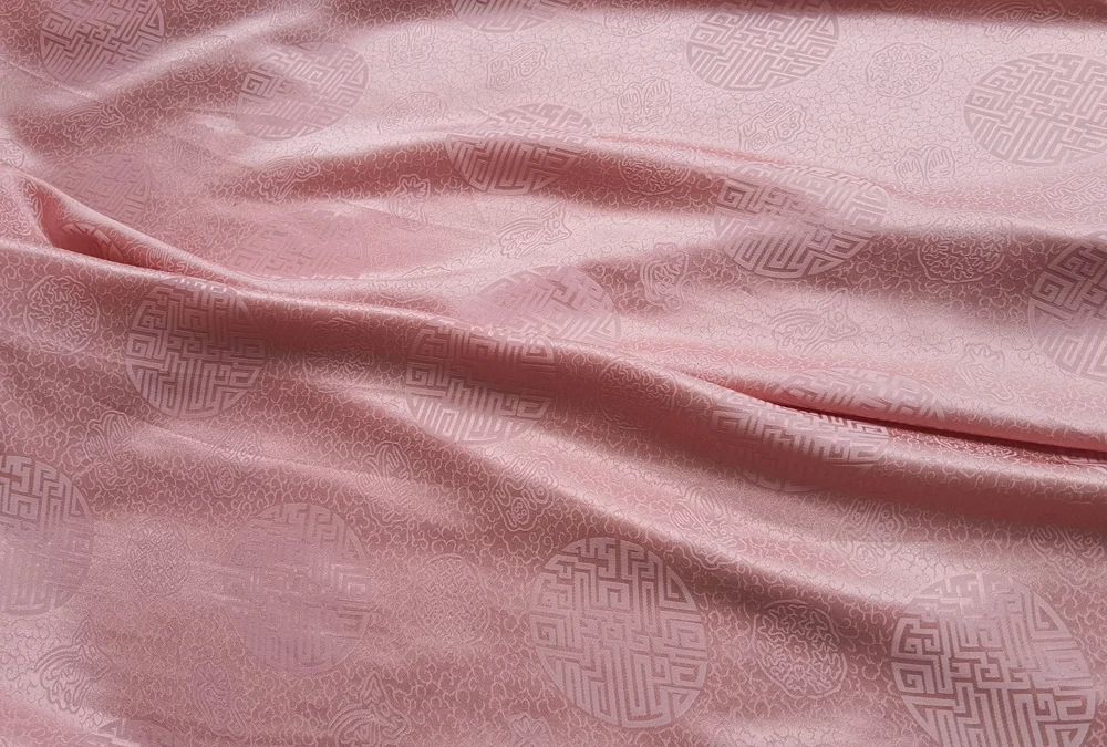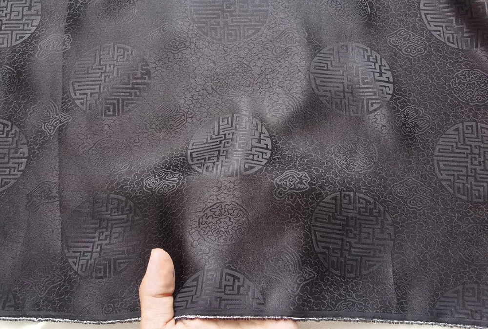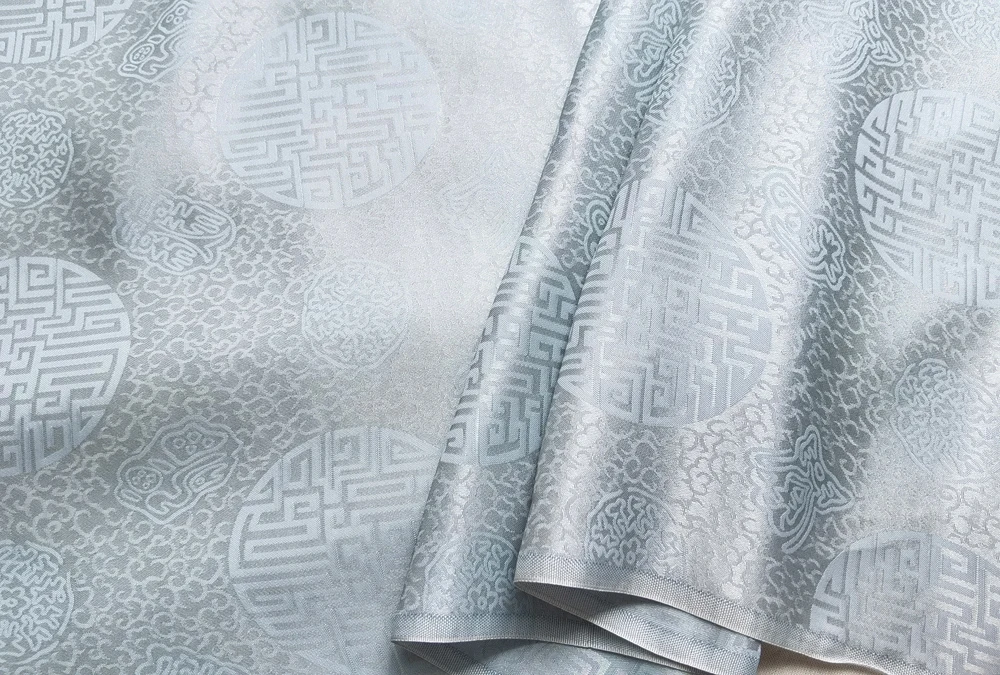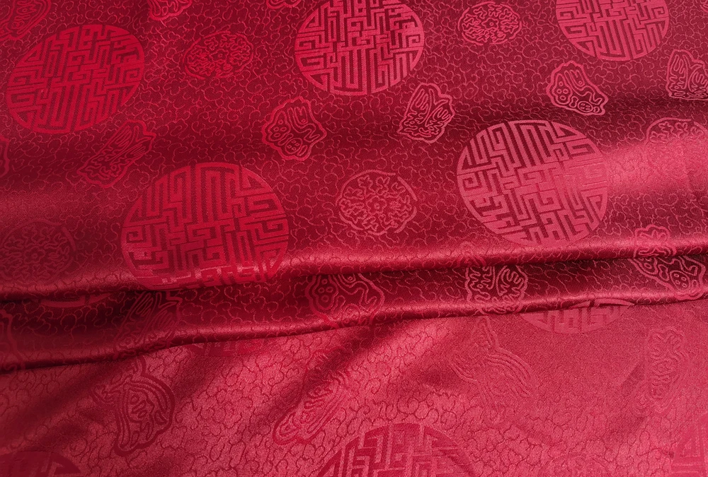 1)Material:Mulberry Silk + Cotton Blended Charmeuse Jacquard,45" Wide,Quality 17momme,Chinese Traditional Pattern