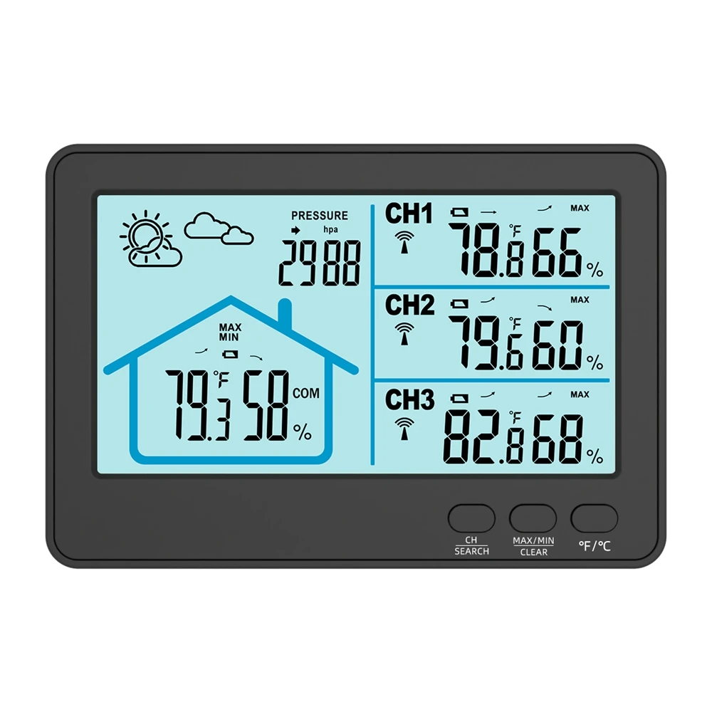 1. LCD display: Display current outdoor humidity/temperature, indoor humidity/temperature, weather forecast and barometric pressure,including 24-hour temperature and humidity maximum and minimum data.