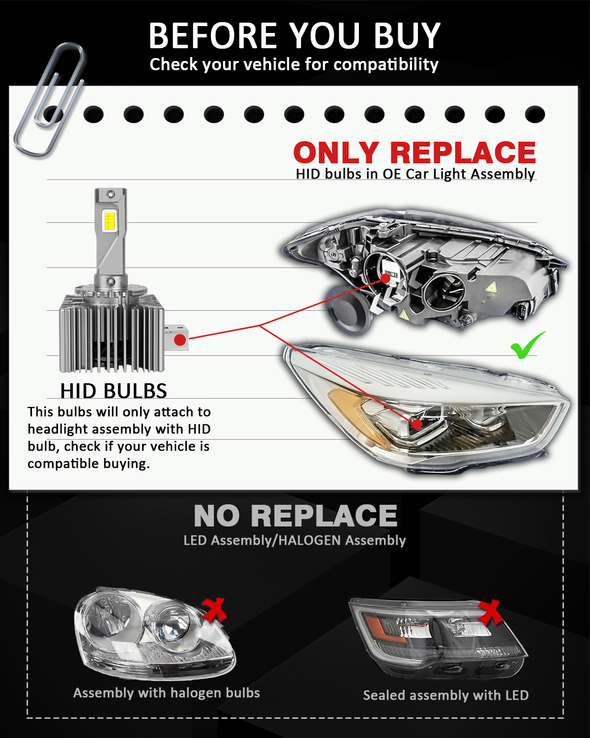 D series LEDs are used to replace xenon lamps. Before purchasing, please confirm whether the original bulb models are the same. If the original car does not have xenon lamps, it cannot be used normally. D series lamps need a ballast to start.