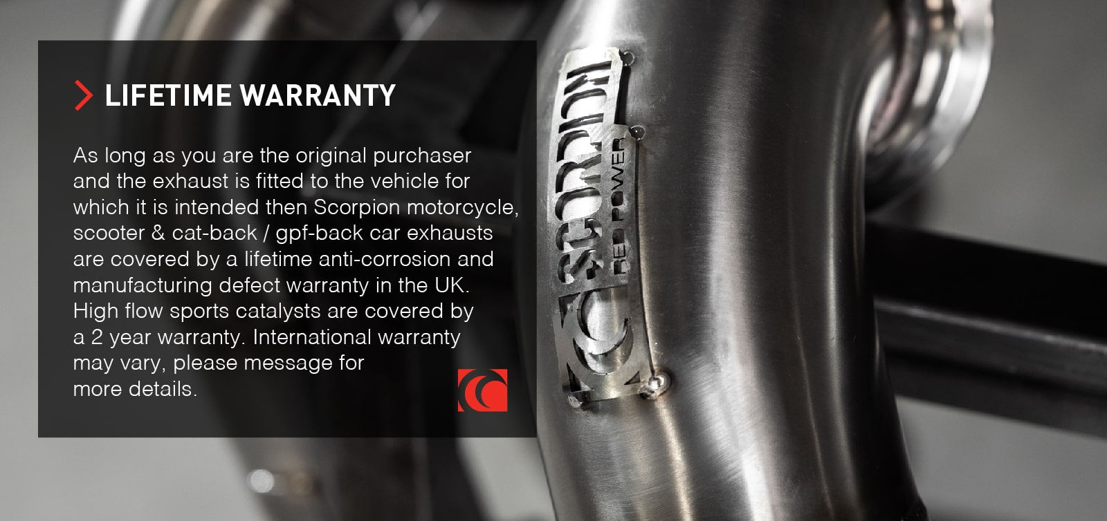 As long as you are the original purchaser and the exhaust is fitted to the vehicle for which it is intended then Scorpion motorcycle, scooter & cat-back / gpf-back car exhausts are covered by a lifetime anti-corrosion and manufacturing defect warranty in the UK. High flow sports catalysts are covered by a 2 year warranty. International warranty may vary, please message for more details.