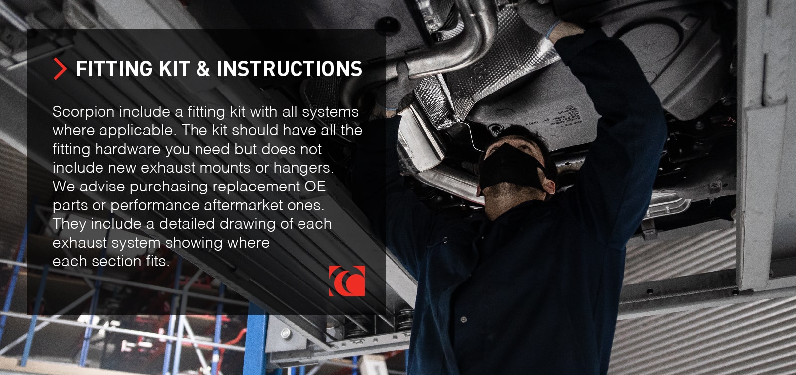 Scorpion include a fitting kit with all systems where applicable. The kit should have all the fitting hardware you need but does not include new exhaust mounts or hangers. We advise purchasing replacement OE parts or performance aftermarket ones. They include a detailed drawing of each exhaust system showing where each section fits.