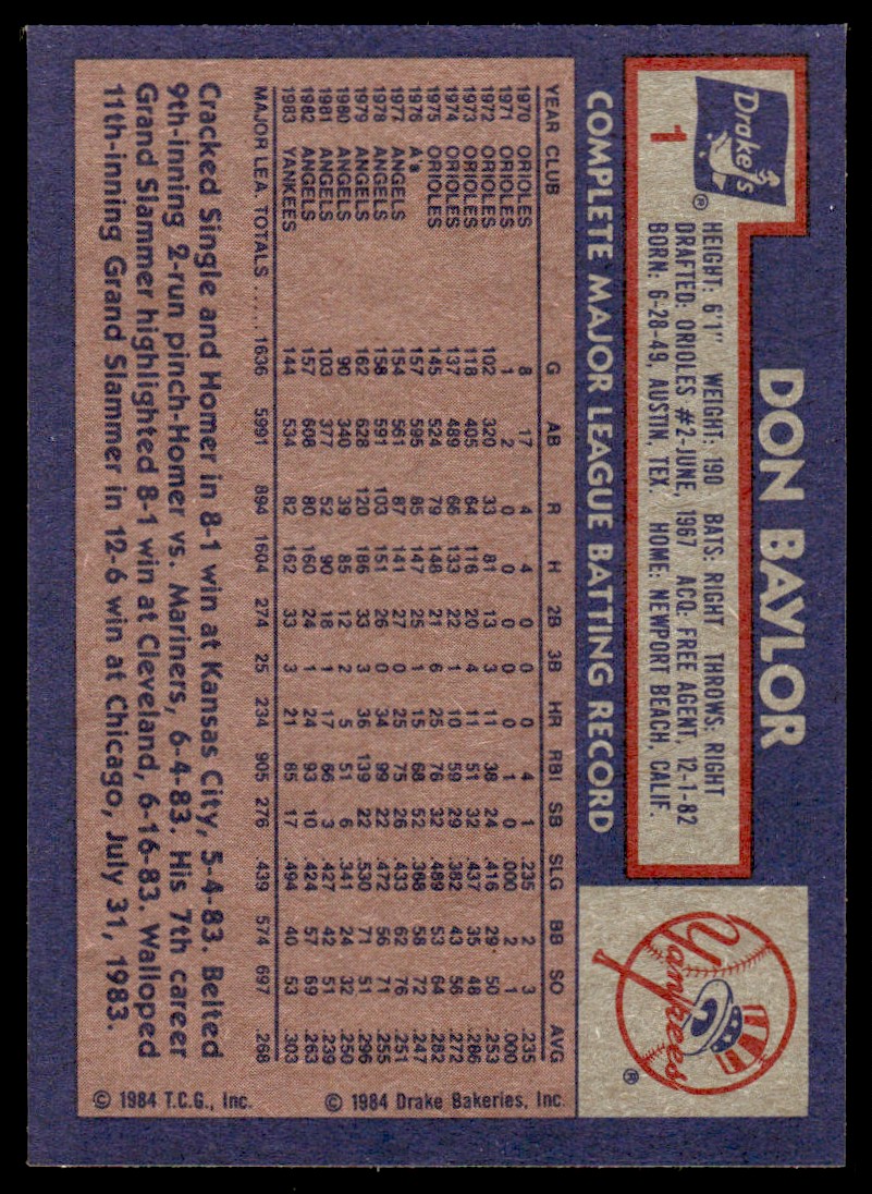 | 1984 Topps Drake's Big Hitters Don Baylor New York Yankees/St. Louis |