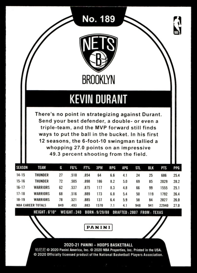 2020-21 Hoops Kevin Durant Brooklyn Nets #189