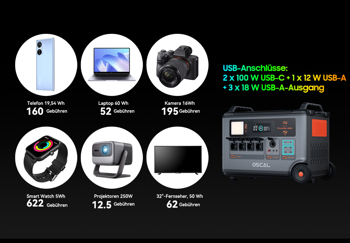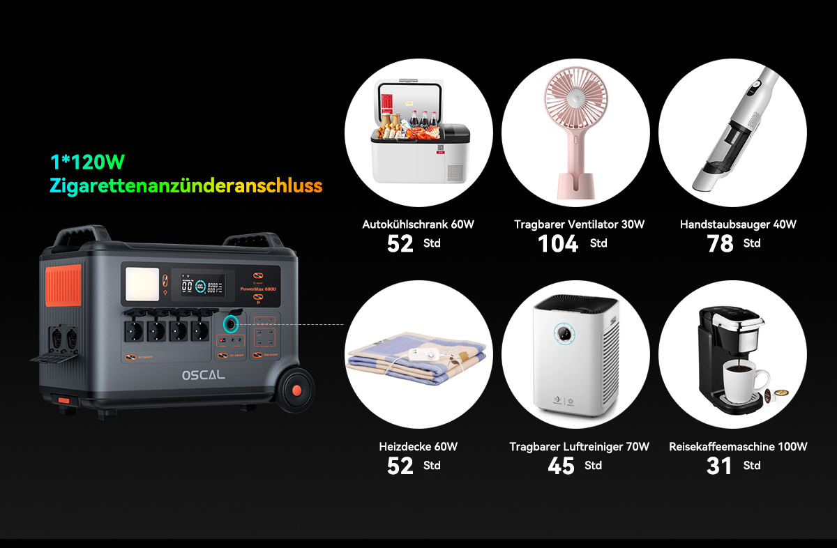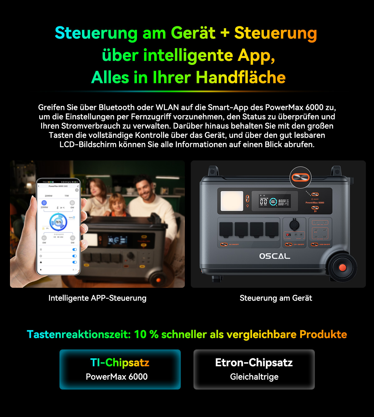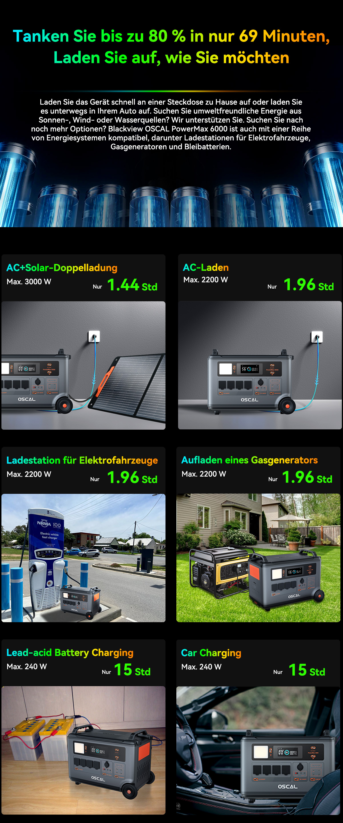 Schnell und flexibel aufladen Ob mit Solarenergie, Netzstrom oder Benzin - der OSCAL PowerMax 6000 lässt sich in Rekordzeit aufladen und versorgt alle Geräte zuverlässig mit Strom. Ob zu Hause, unterwegs oder im Notfall, Sie können aus sechs verschiedenen Lademethoden wählen, die zu Ihrem Szenario passen und Ihren Energiebedarf optimal abdecken.