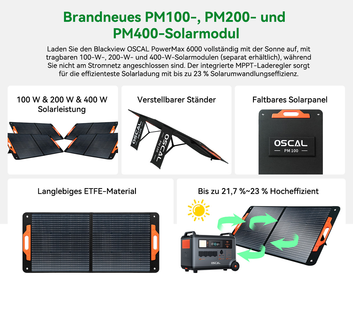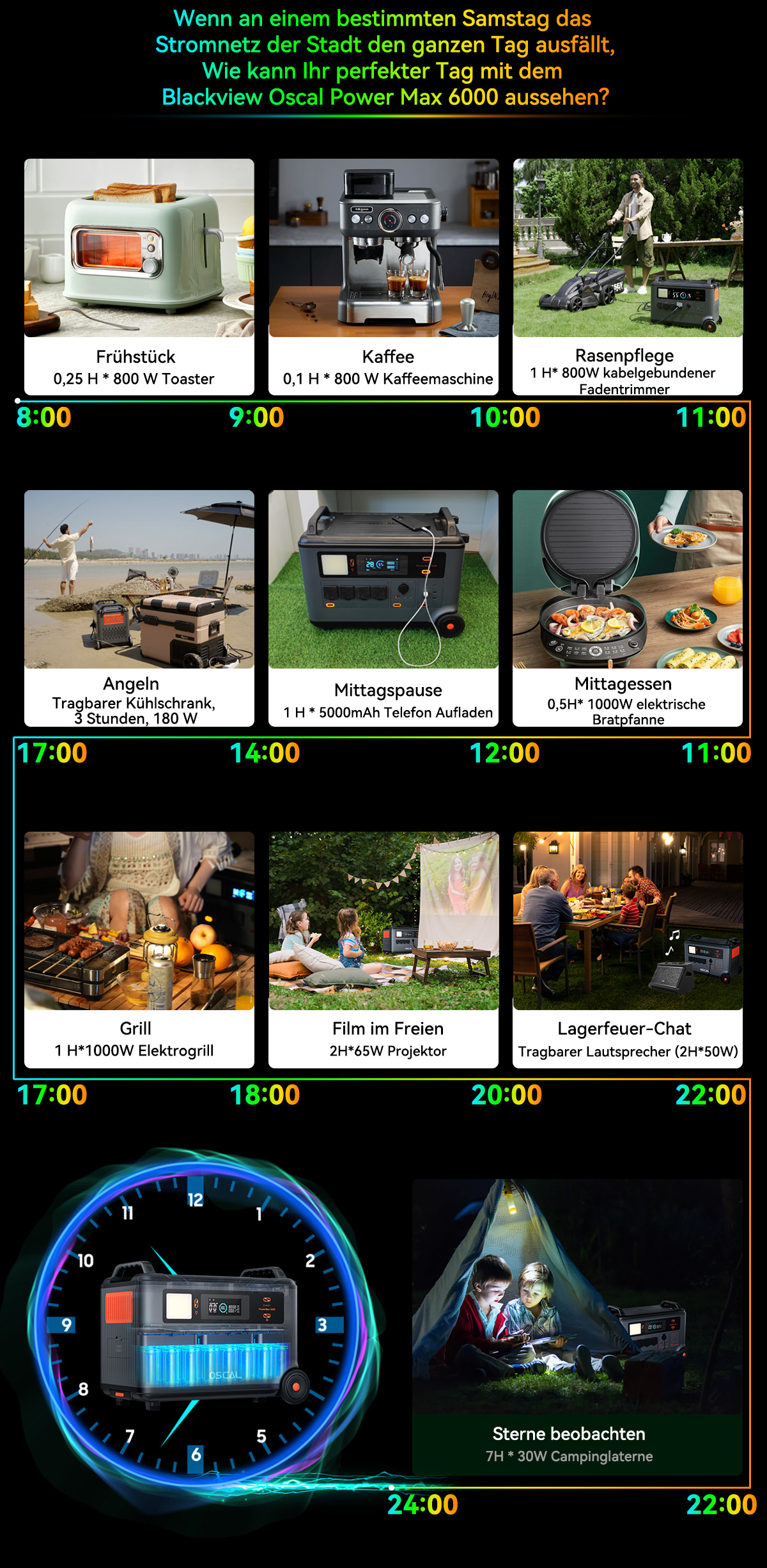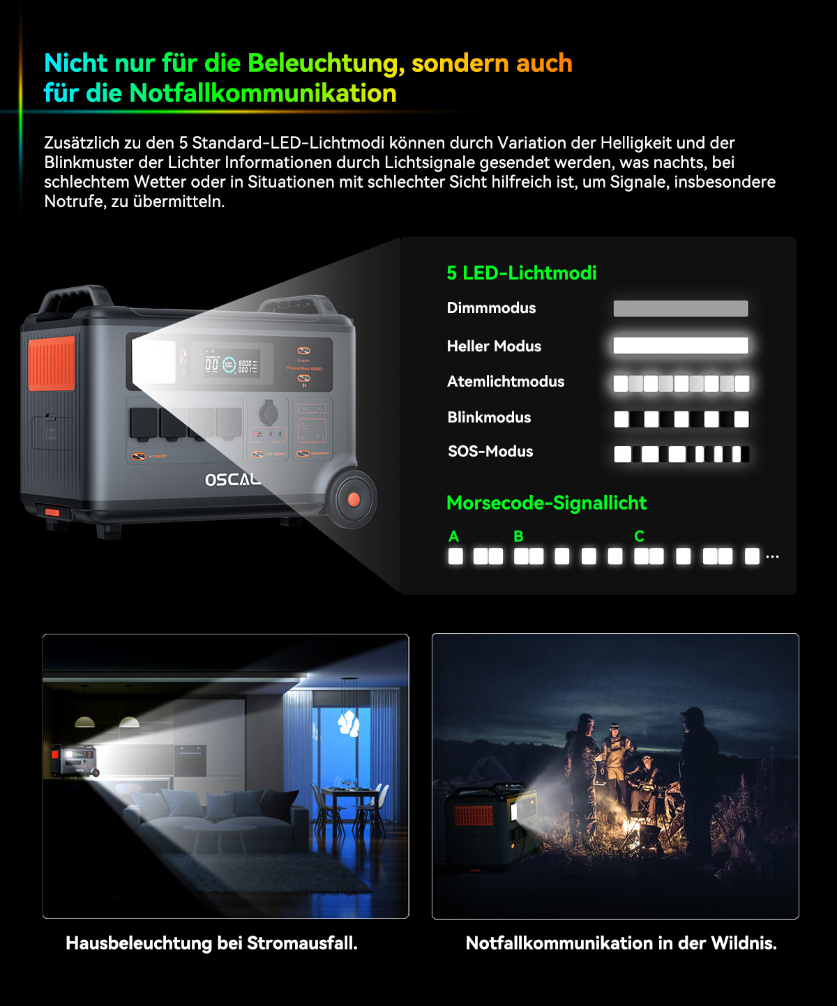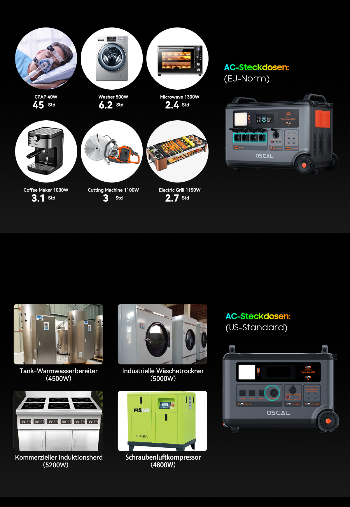 Schnell und flexibel aufladen Ob mit Solarenergie, Netzstrom oder Benzin - der OSCAL PowerMax 6000 lässt sich in Rekordzeit aufladen und versorgt alle Geräte zuverlässig mit Strom. Ob zu Hause, unterwegs oder im Notfall, Sie können aus sechs verschiedenen Lademethoden wählen, die zu Ihrem Szenario passen und Ihren Energiebedarf optimal abdecken.
