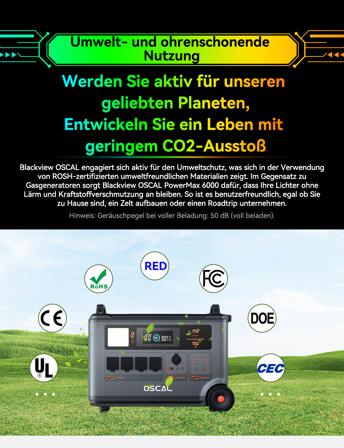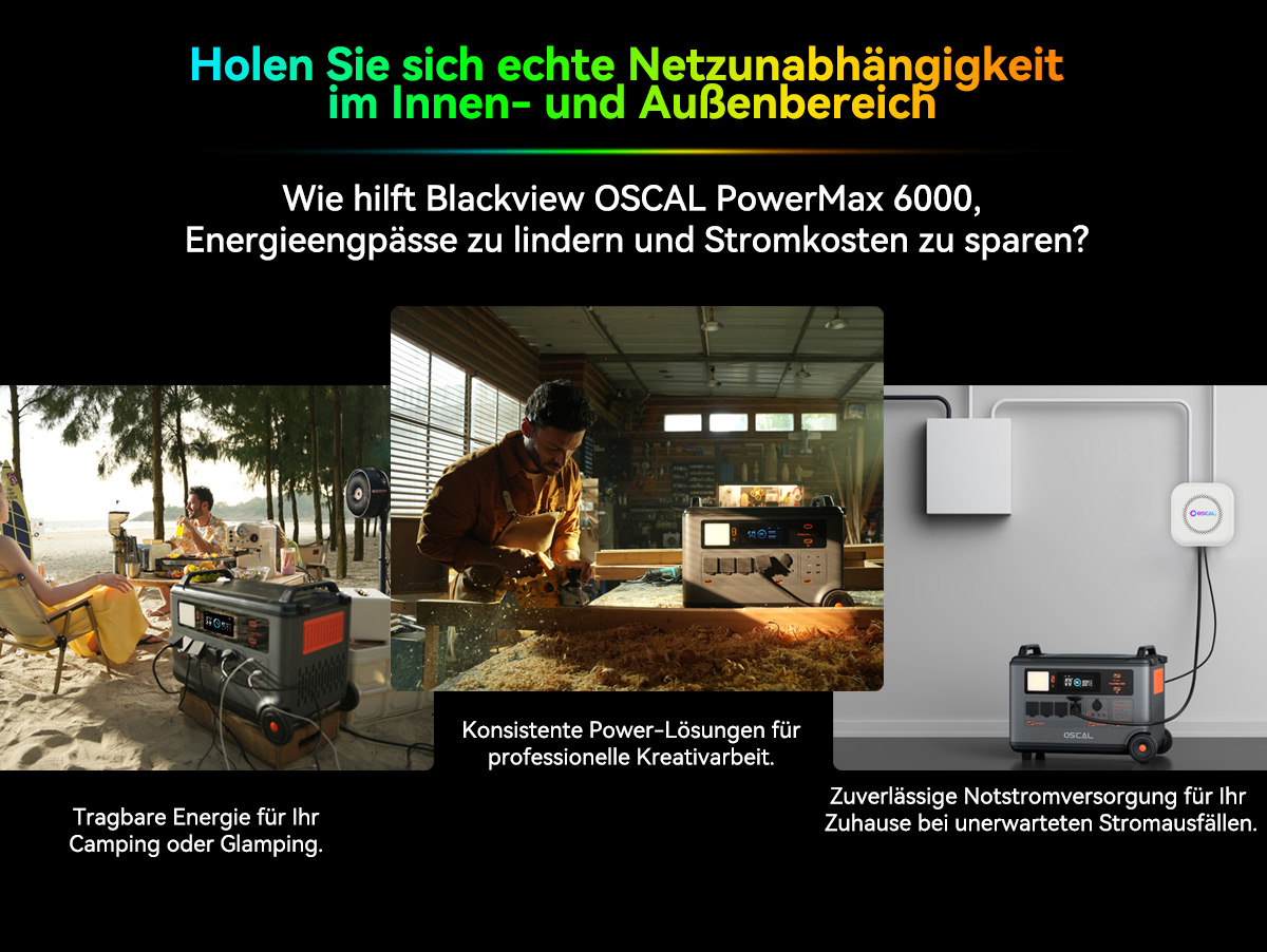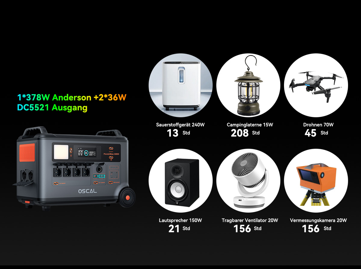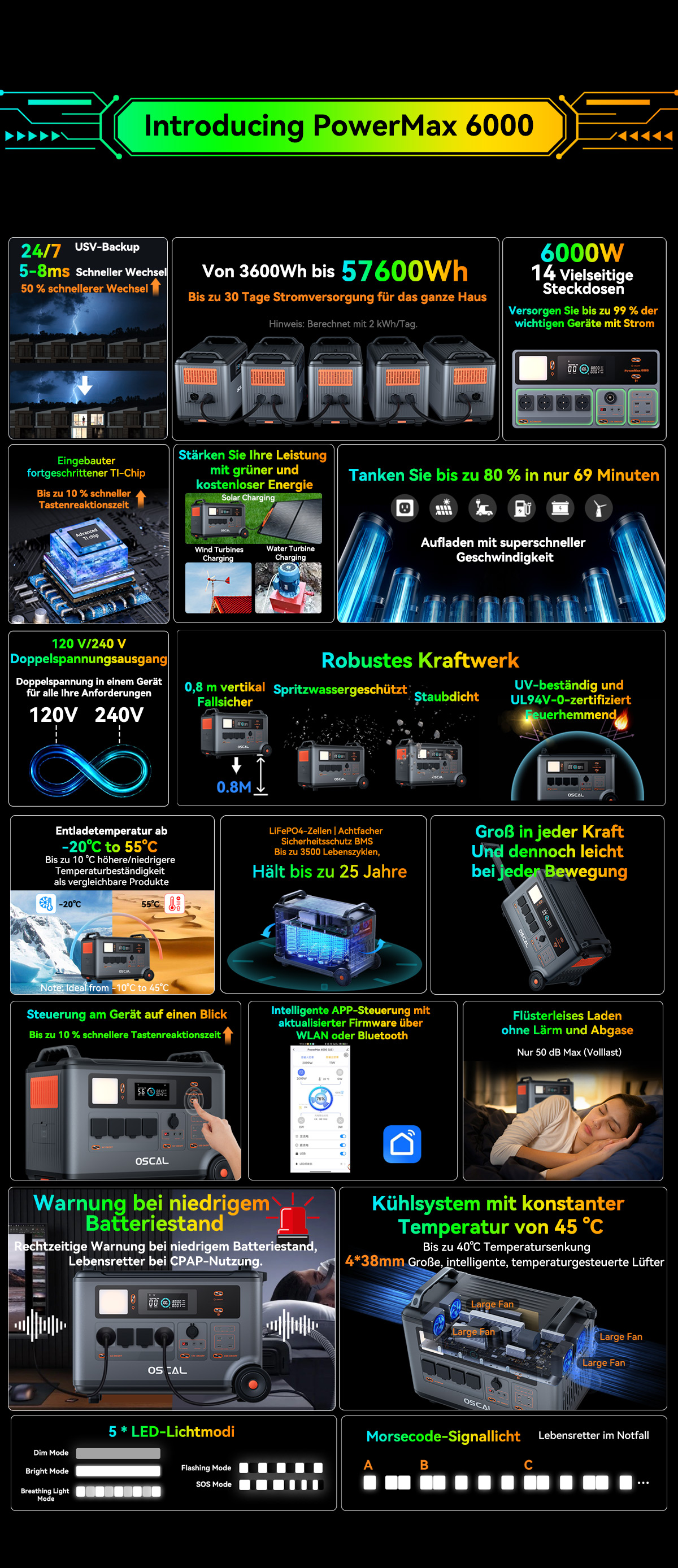 OSCAL Power Max 6000 - ein neu entwickeltes tragbares Energiespeicher- und Ladegerät, das sturzsicher, spritzwassergeschützt und staubdicht ist und sich für den Innen- und Außenbereich eignet.