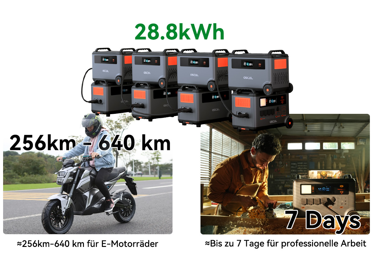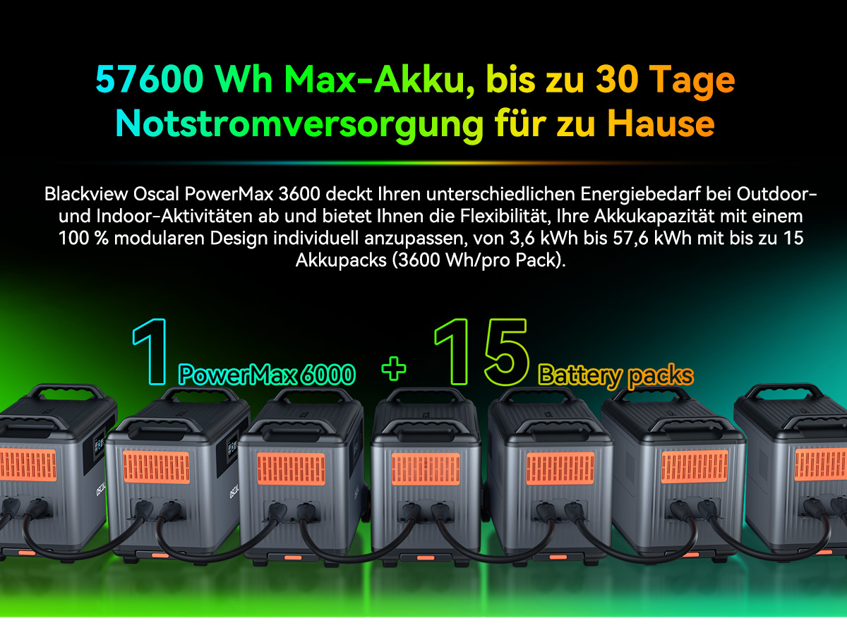 Der PowerMax 6000 ist vollständig modular aufgebaut und bietet Platz für bis zu 15 zusätzliche Batteriepacks (3,6 kWh/Stück). Bei einem durchschnittlichen Verbrauch von 2 kWh pro Tag reichen 57,6 kWh für bis zu 30 Tage.