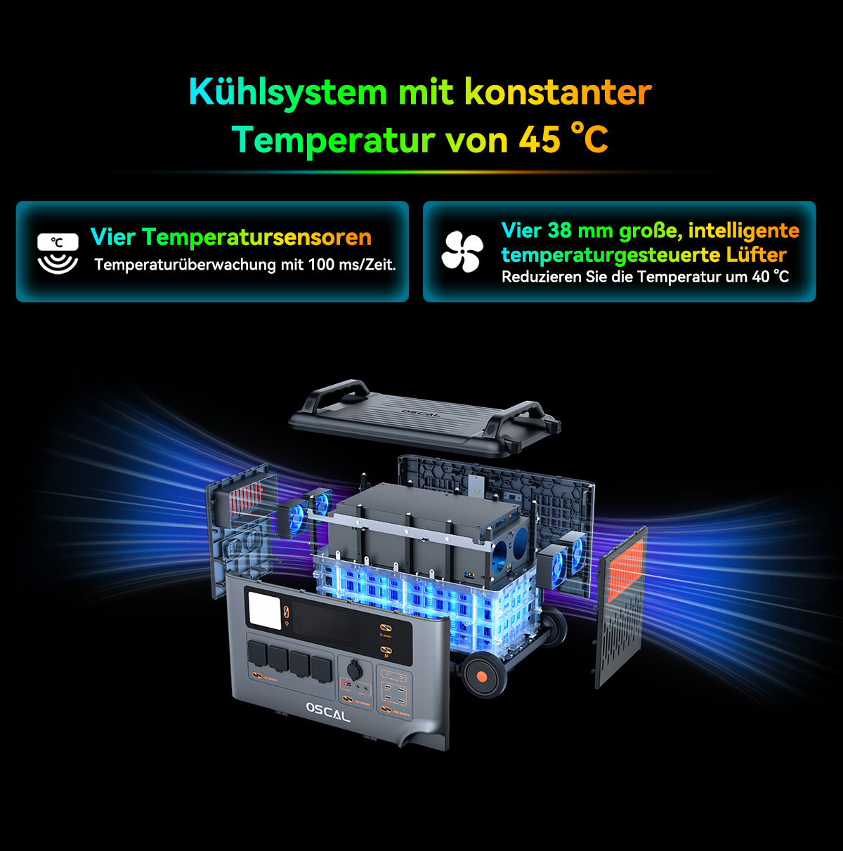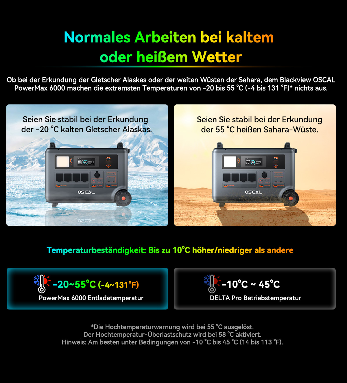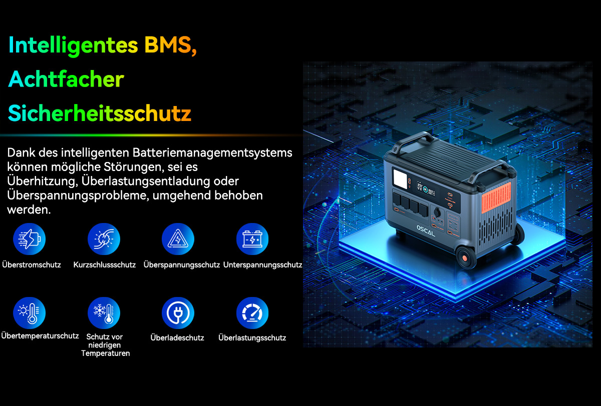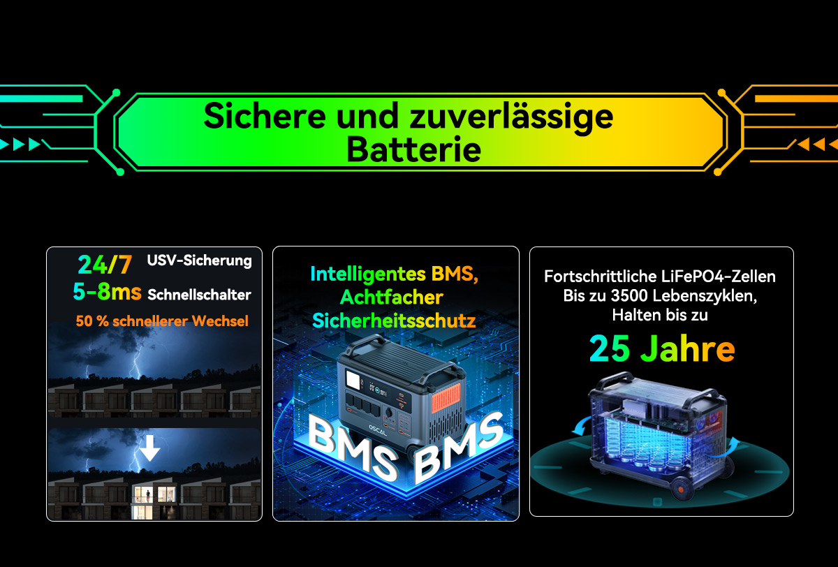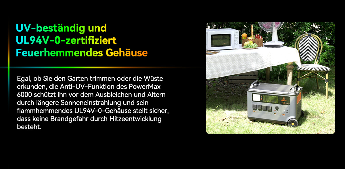 Die verstärkte ABS+PC-Konstruktion des PowerMax 6000 übersteht Stürze aus bis zu 0,8 m und widersteht effektiv festen Partikeln und senkrechten Wasserspritzern. Der Betriebstemperaturbereich beträgt -20°C bis 55°C. Das UL94V-0 flammhemmende Gehäuse verhindert Brände. Betrieben von langlebigen LiFePO4-Batterien und unterstützt von einem fortschrittlichen achtstufigen Sicherheits-BMS. Geschützt gegen Überladung, Überentladung, Überspannung, Überstrom, Kurzschluss und Temperaturschwankungen ermöglichen bis zu 3500 Lade- und Entladezyklen und eine Lebensdauer von bis zu 25 Jahren.