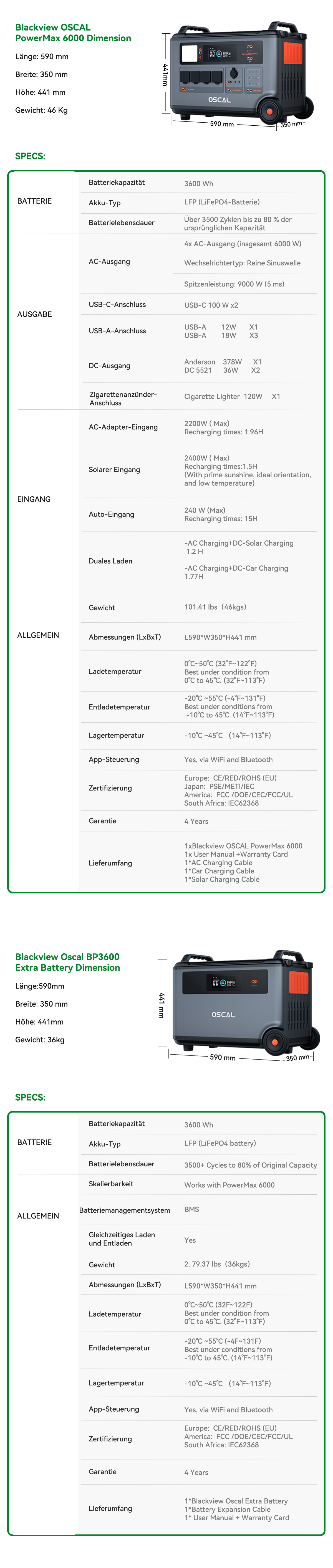Lieferumfang - Der Lieferumfang umfasst die tragbare PowerMax 6000-Ladestation, ein AC-Ladekabel, ein Autoladekabel, ein Solarladekabel, eine Regenhülle, eine Bedienungsanleitung und eine Garantiekarte.