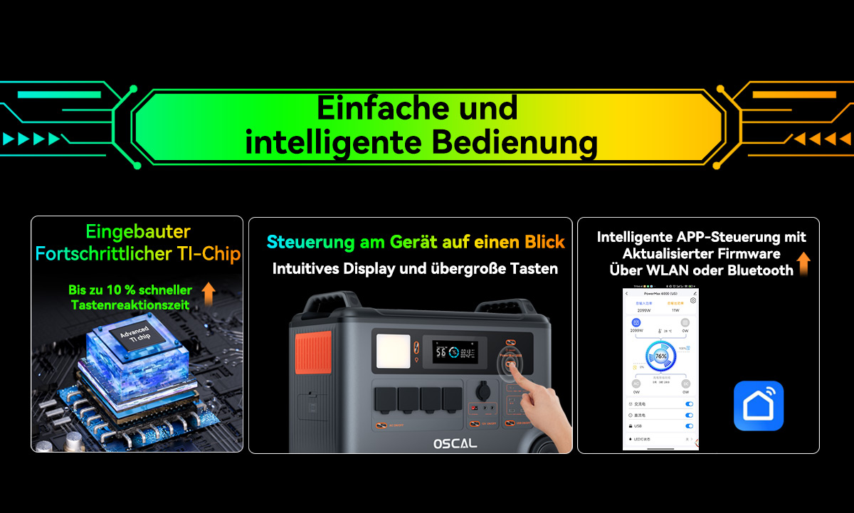 Laden Sie die entsprechende App auf Ihr Smartphone und verbinden Sie die tragbare Stromstation einfach über Wi-Fi oder Bluetooth mit der OSCAL-App. Überwachen Sie den Energieverbrauch und führen Sie ganz einfach Fernsteuerungsaufgaben aus.