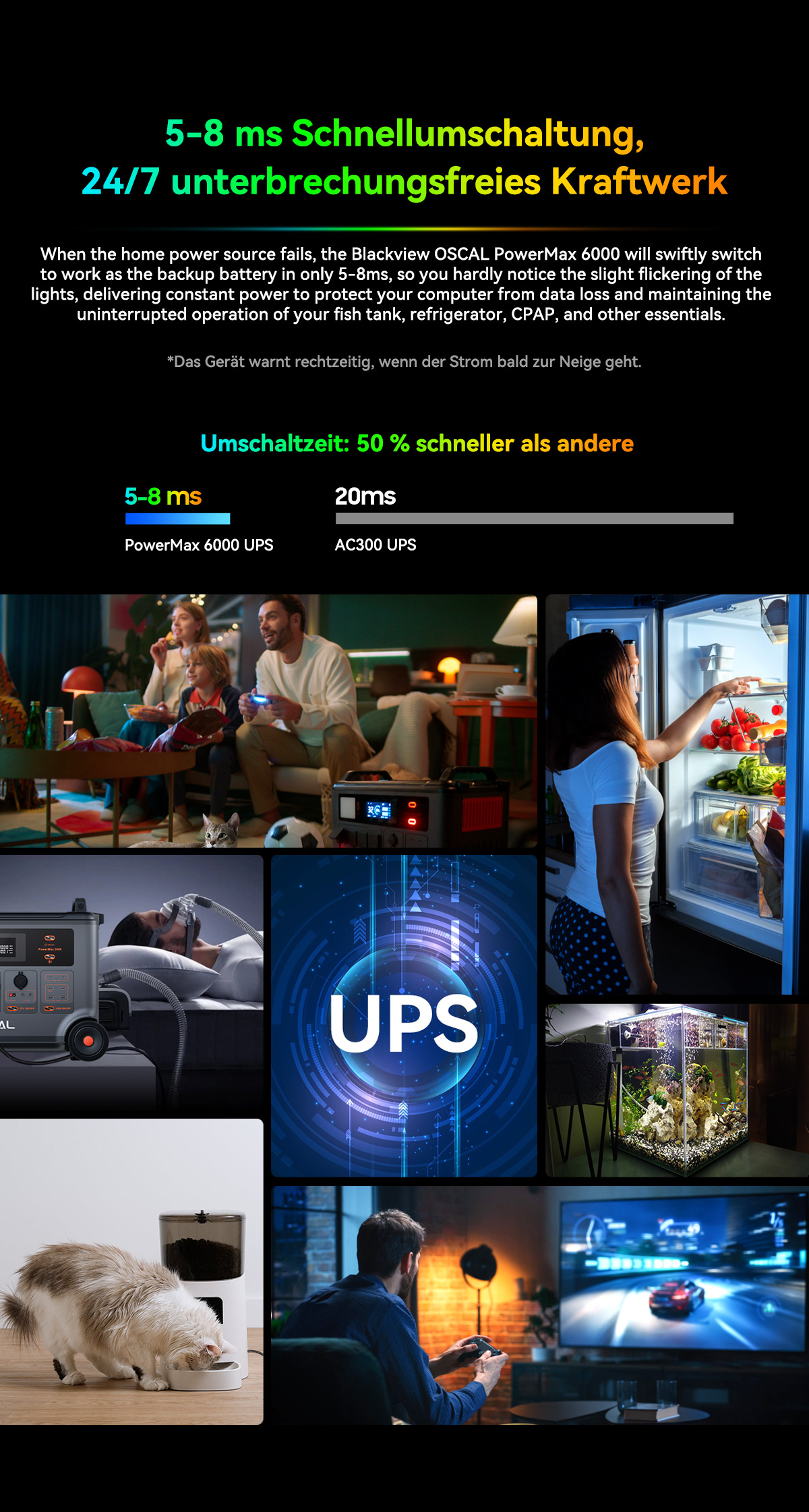 Ausgestattet mit einer unterbrechungsfreien Stromversorgung (UPS) schaltet das Gerät bei Stromausfall oder -unterbrechung innerhalb von 5-8 ms automatisch auf die interne Batteriestromversorgung um. Ideal für häusliche Notfälle, Netzwerkgeräte und Außenanwendungen, die eine unterbrechungsfreie Stromversorgung erfordern.