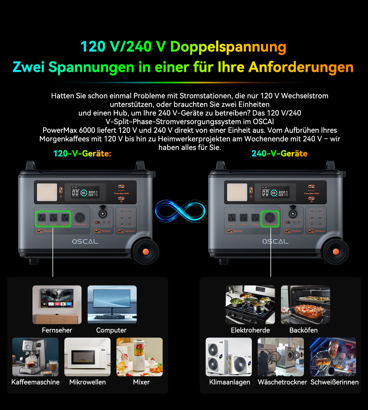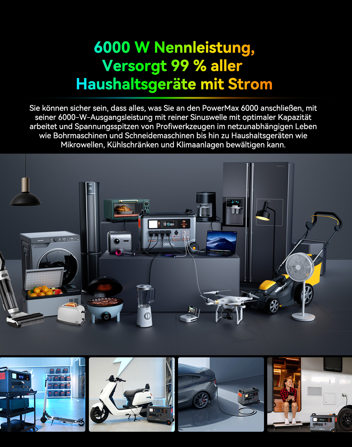 PowerMax 6000 Kann 99% der Basisgeräte aufladen. Mit einer Kapazität von 3600Wh, 6000W Leistung und 7200W Spitzenleistung bietet es 4*AC-Ausgänge, 4*USB-A-Ausgänge und 2*100W schnelle USB-C-Ausgänge sowie zwei DC-Ausgänge und unterstützt mehr als 99% der Geräte, wie Klimaanlagen, Heizungen und Kaffeemaschinen. Ob beim Camping, bei Arbeiten im Freien oder in Notfällen, dieser Solargenerator kann stabile Energie liefern.
