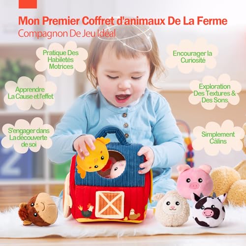 hahaland Jouet Bebe 6 Mois Animaux de la Ferme en Peluche, Jeux Montessori avec Grange, Hochets, Miroirs Jouet Sensoriel Bebe 0-6 Mois, Cadeau Bebe Enfant 3 6 9 Mois Garçon Fille