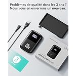 Contenu du coffret: 1 x Batterie externe de 10000mAh, 1 x Câble USB-C, 1 x Manuel d’utilisation, 1 x Pochette de voyage, une garantie de remboursement de 30 jours, une garantie de 3 ans, la meilleure du secteur, et une assistance technique à vie.