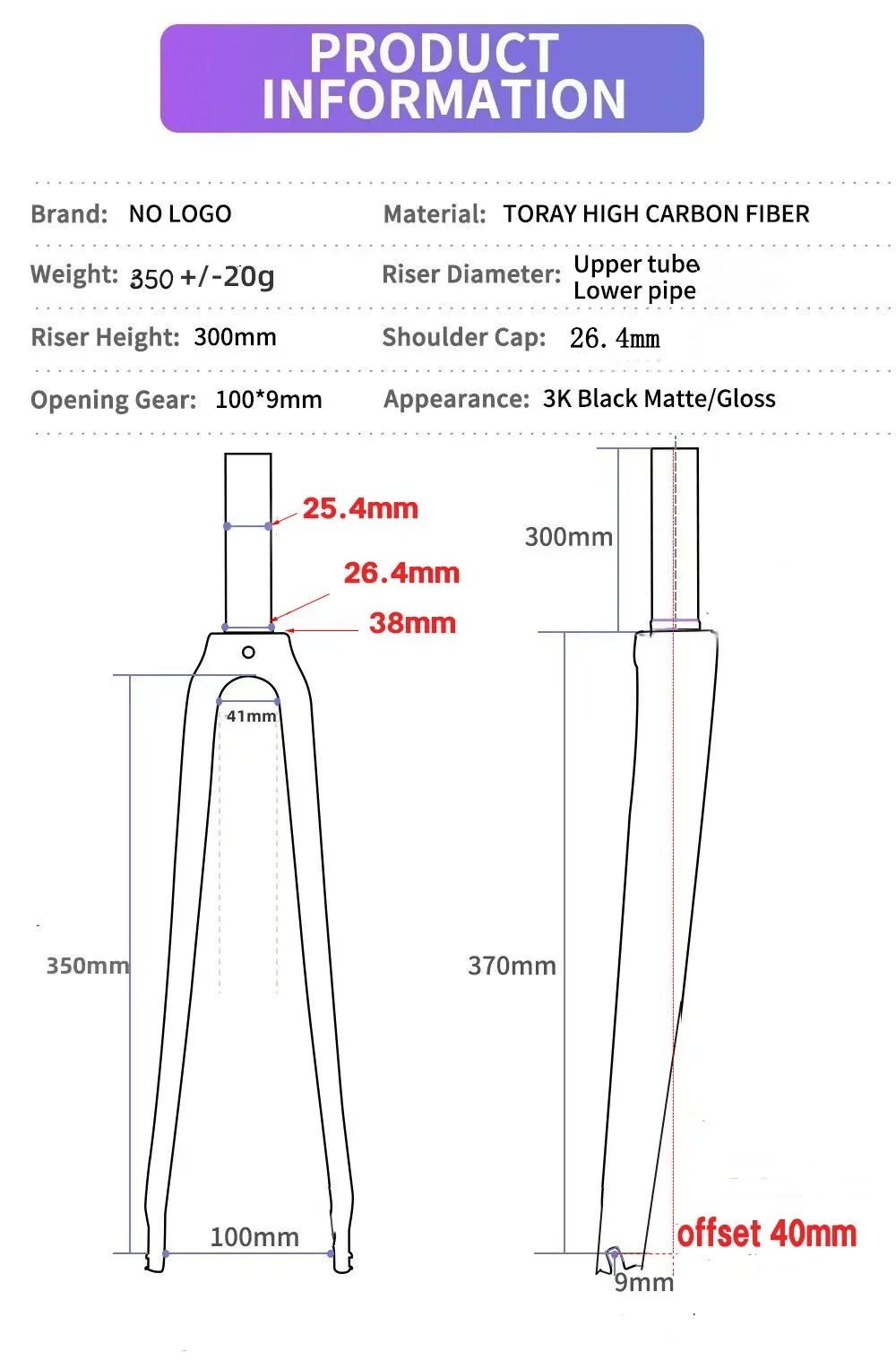Riser Diameter:Upper tube:25.4mm Lower pipe:26.4mm