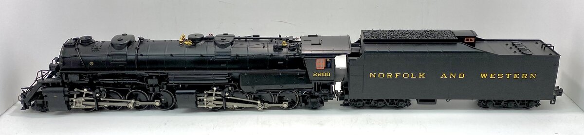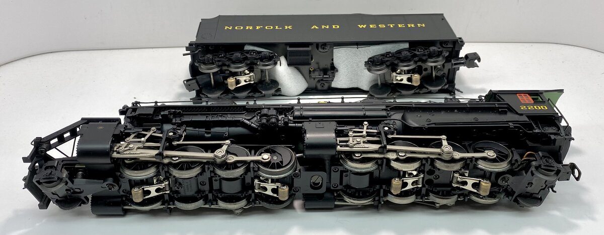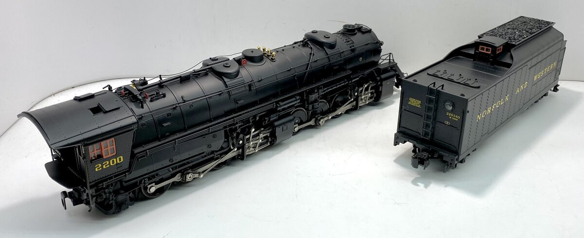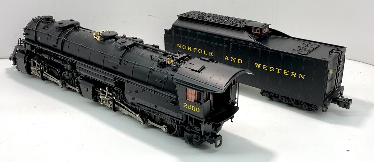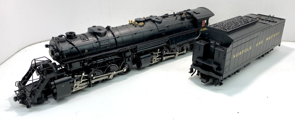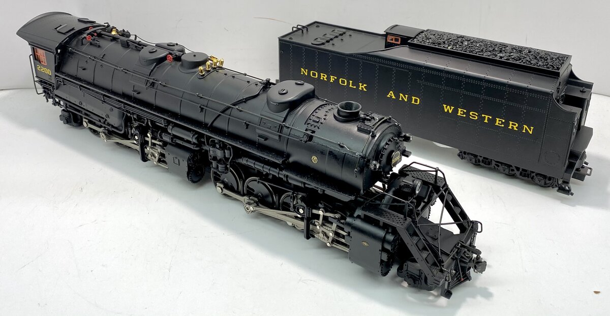 Here is a Lionel 6-28085 O Gauge Norfolk and Western 2-8-8-2 Y6B Mallet Steam Locomotive and Tender #2200 from 2003. In 1952, locomotive #2200, a Y6b class 2-8-8-2, rolled out of the Norfolk & Western Railway’s Roanoke Shops. It would be the last American mainline steam locomotive and would ride the rails of the nation’s last Class I steam railroad. Producing 5,500 horsepower and 152,026 pounds of tractive effort, the Y6b was the zenith of the Mallet articulated steam locomotive type. Along with the J class 4-8-4 and the A class 2-6-6-4, the Y6b formed a motive power triumvirate in the last bastion of the steam locomotive. As late as 1958, the Y6b was still king of the mountain, sharing the rails with the N&W’s first generation diesel locomotives. Living up to the prototype, our model features peak performance and many new innovations. The refined Conventional Transformer Control Mode allows for lower starting speeds, improved smoke output and simplified Odyssey System controls when operating in a non-TMCC environment. Each driver is individually sprung for a full chassis suspension. Running gear is painstakingly reproduced down to the working lubricator linkage. The industry-standard RailSounds sound system includes two FatBoy speakers for added depth and clarity. The #2200 comes to life with an accurate array of prototypical sounds including a melodious whistle inspired by actual recordings of a Y6b in its prime. Just like the prototype, the synchronized chuffing of our model reproduces the unique shift from "simple" to "compound" as the locomotive gains speed. Another Lionel first, an all-new smoke system synchronizes smoke output, sound and motion. As the Y6b battles a tough grade, watch the valve gear pound, hear the labored chuff, see the smoke skyrocket forth. No other model offers a more accurate re-creation of N&W’s greatest giant conquering Virginia’s notorious Blue Ridge. Building on the legendary details of the Joshua Lionel Cowen Series, such as realistic separately applied coal load, see-through boiler walkways and opening cab roof hatches, the new Y6b raises the bar even further. Virtually all piping and appliances such as the Worthington SA feedwater heater are separately applied. A separate cord runs from the cab to the whistle. The fully detailed interior includes painted valve handles and gauges with wood planking detail on the cab ceiling. The cab walls and ceiling are even painted a prototypical shade of industrial green. With the highest level of detail and unprecedented performance, this all-new locomotive is the definitive Y6b in O gauge. Features include Produced from all-new tooling, TrainMaster Command Control equipped and is able to run in Command Control Mode or in Conventional Transformer Control Mode, Odyssey System for speed control with ON/OFF switch, refined Conventional Transformer Control Mode with lower starting speeds, knuckle couplers, diecast construction, improved smoke output and simplified Odyssey System controls, RailSounds sound system with CrewTalk communication.