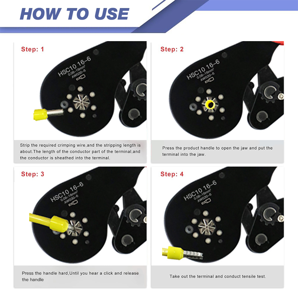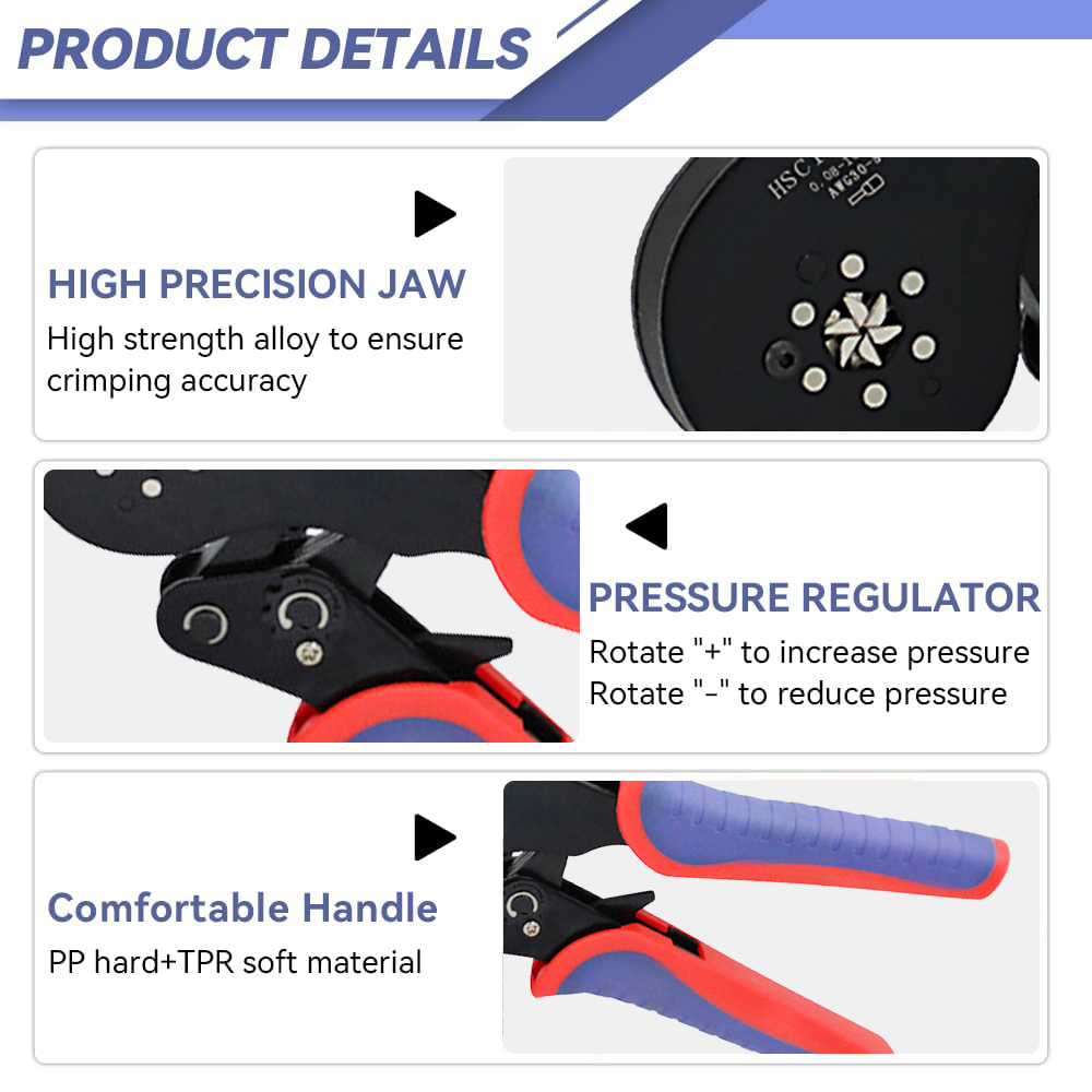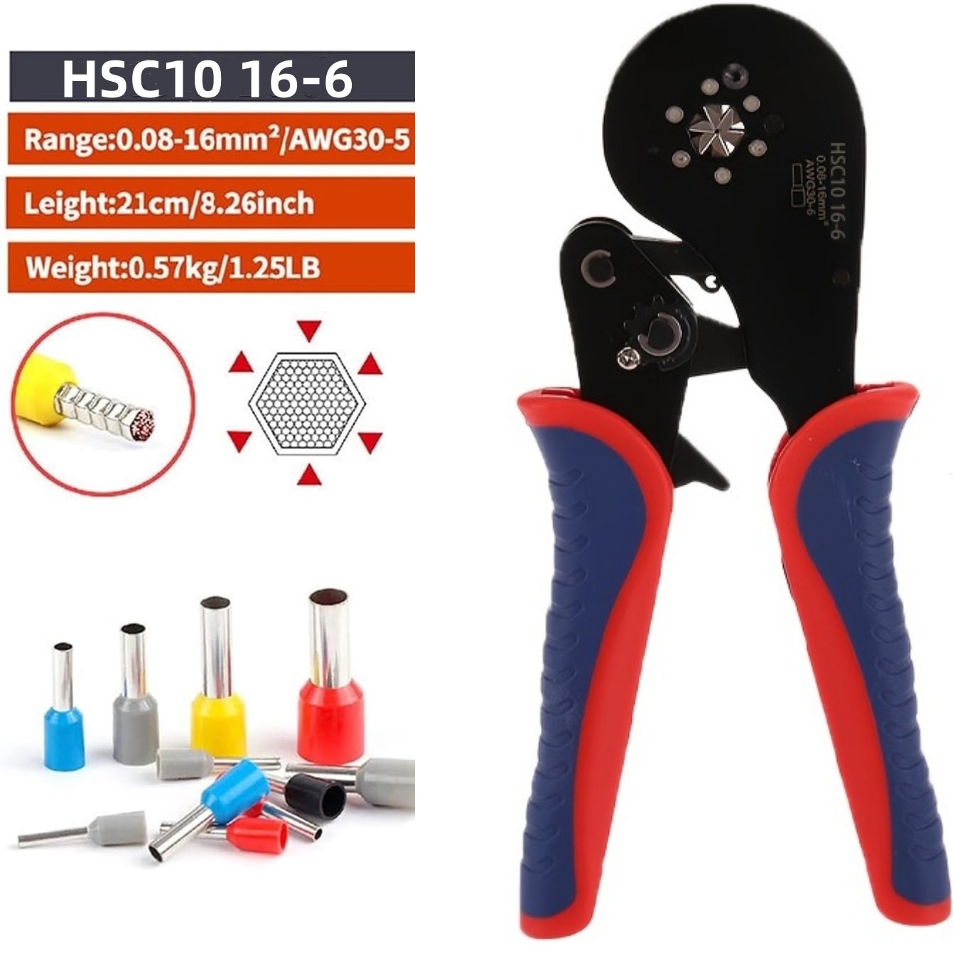 Einzigartiges sechseckiges Crimp-Design: Dieses Werkzeug verfügt über ein spezielles sechseckiges Crimp-Profil. Aderendhülsen werden in dieser Form auf Litzen gecrimpt, wodurch die feinen Drahtlitzen effektiv vor dem Ausfransen geschützt und feste, sichere Verbindungen gewährleistet werden. Die Druckeinstellung ist einfach: Lösen Sie einfach die Schrauben am Astrolabium und bewegen Sie es mit einem harten Gegenstand, um den Crimpdruck schnell an verschiedene Drahttypen anzupassen und so optimale Ergebnisse zu erzielen.