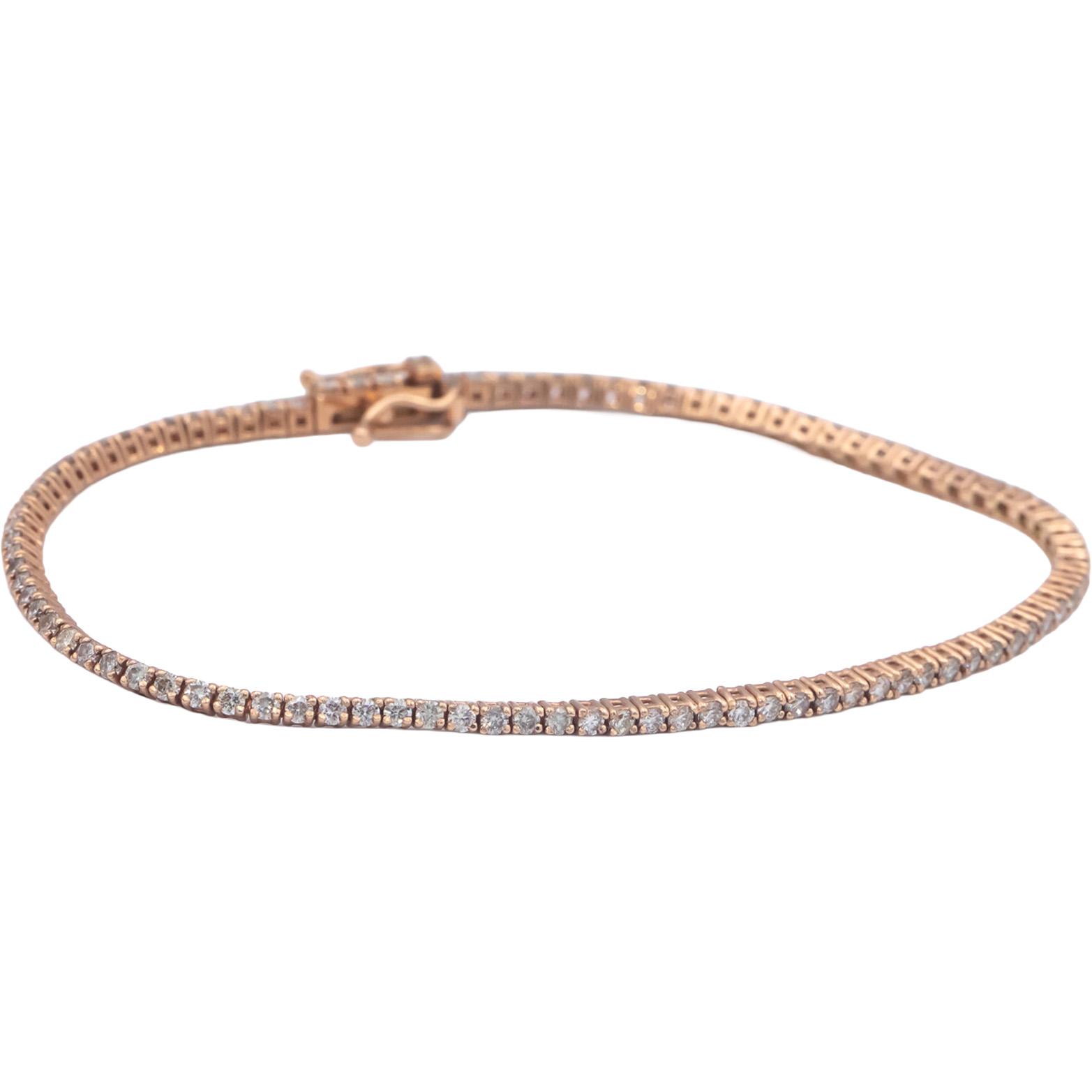Crafted from 14k rose gold, this piece features a continuous line of round white diamonds, totaling 1.69 carats (SI2 - I1 clarity/H - I color). The diamonds are meticulously set to enhance their brilliance. A secure clasp ensures a perfect fit.