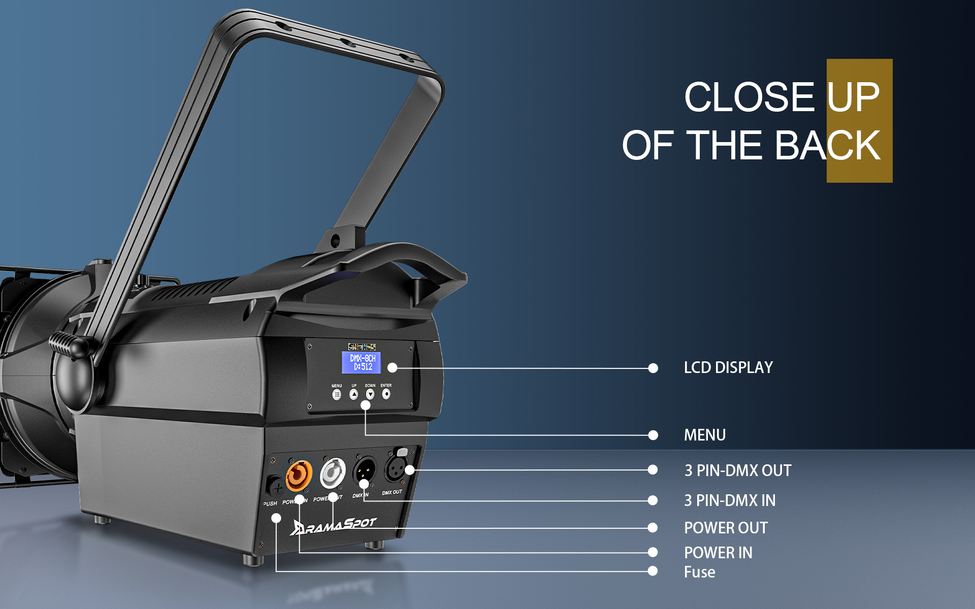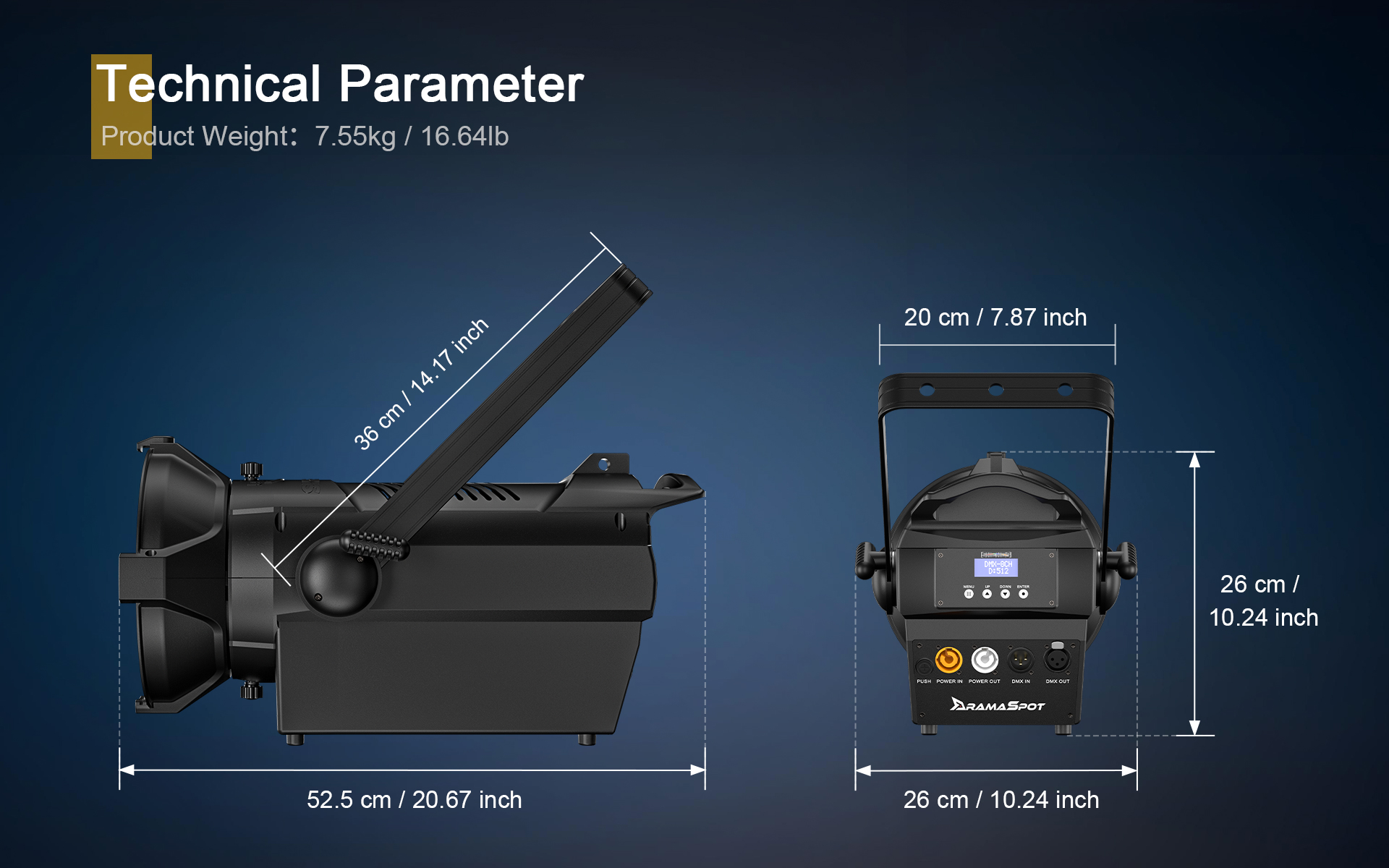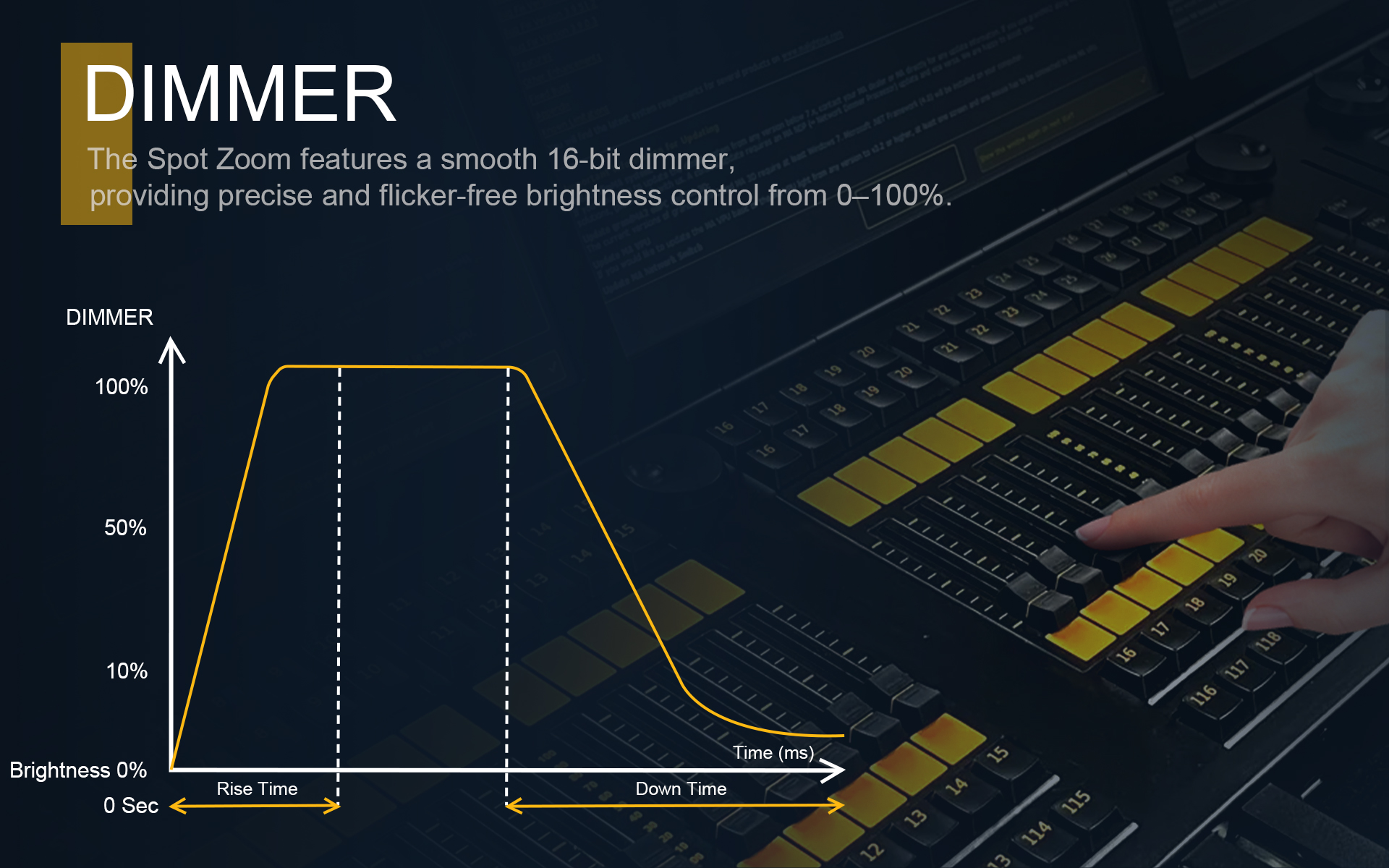 The Spot Zoom250W/350W features a smooth 16-bit dimmer, providing precise and flicker-free brightness control from 0–100%.